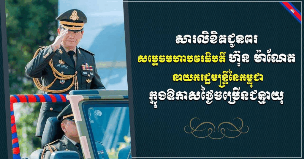 ក្នុងឱកាសដ៏មង្គលសួស្តី នៃថ្ងៃខួបកំណើត សម្តេចមហាបវរធិបតី ហ៊ុន ម៉ាណែត នាយករដ្ឋមន្រ្តីនៃព្រះរាជាណាចក្រកម្ពុជា គម្រប់ ៤៨ឆ្នាំ ឈានចូល ៤៩ឆ្នាំ នាថ្ងៃទី២០ ខែតុលា ឆ្នាំ២០២៥, អ្នកឧកញ៉ា ហេង បូរិន អគ្គនាយកក្រុមហ៊ុន ហេង បូរិន គ្រុប និងលោកជំទាវ សូមផ្ញើសារលិខិតគោរពជូនពរ សម្តេចមហាបវរធិបតី ទទួលបានសុខភាពល្អបរិបូរណ៍ បញ្ញាញាណភ្លឺថ្លា អាយុយឺនយូរ ដើម្បីបន្តបេសកកម្មដ៏ឧត្តុង្គឧត្តម ដើម្បីដឹកនាំកម្ពុជាឱ្យរីកចម្រើនរុងរឿងតទៅ។