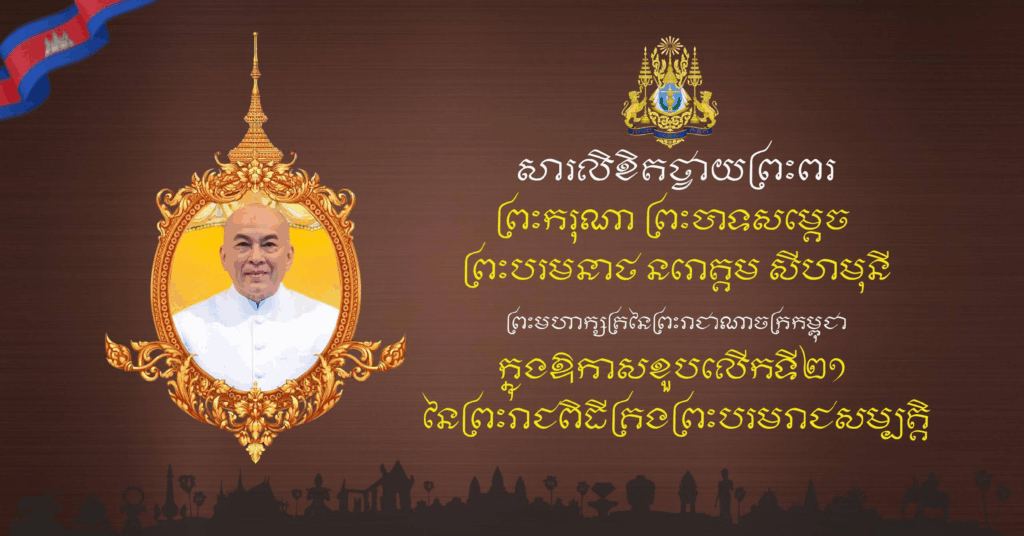 (ភ្នំពេញ)៖ ក្នុងឱកាសដ៏មហានក្ខត្តឫក្ស សិរីសួស្តី ជ័យមង្គល ប្រសើរថ្លៃថ្លា ឧត្តុង្គឧត្តមប្រកបដោយសេចក្តីសោមនស្សរីករាយ ខួបលើកទី២១ នៃព្រះរាជពិធីគ្រងព្រះបរមរាជសម្បត្តិ របស់ព្រះករុណា ព្រះបាទសម្តេច ព្រះបរមនាថ នរោត្តម សីហមុនី ព្រះមហាក្សត្រនៃព្រះរាជាណាចក្រកម្ពុជា ជាទីគោរពសក្ការៈដ៏ខ្ពង់ខ្ពស់បំផុត ដែលប្រព្រឹត្តទៅនៅថ្ងៃពុធ ៨កើត ខែកត្តិក ឆ្នាំម្សាញ់ សប្តស័ក ព.ស.២៥៦៩ ត្រូវនឹងថ្ងៃទី២៩ ខែតុលា ឆ្នាំ២០២៥។