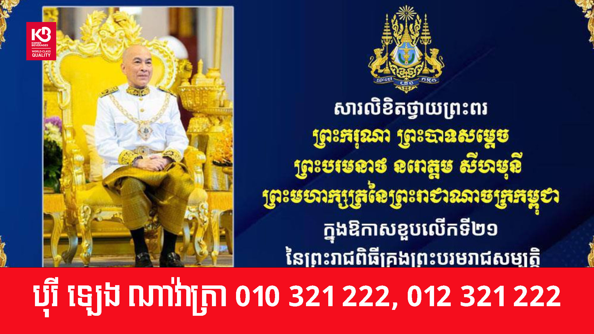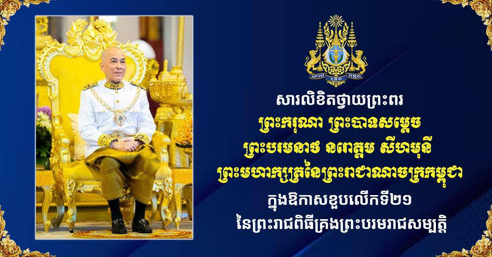 (ភ្នំពេញ)៖ ក្នុងឱកាសដ៏មហានក្ខត្តឫក្ស សិរីសួស្តី ជ័យមង្គល ប្រសើរថ្លៃថ្លា ឧត្តុង្គឧត្តមប្រកបដោយសេចក្តីសោមនស្សរីករាយ ខួបលើកទី២១ នៃព្រះរាជពិធីគ្រងព្រះបរមរាជសម្បត្តិ របស់ព្រះករុណា ព្រះបាទសម្តេច ព្រះបរមនាថ នរោត្តម សីហមុនី ព្រះមហាក្សត្រនៃព្រះរាជាណាចក្រកម្ពុជា ជាទីគោរពសក្ការៈដ៏ខ្ពង់ខ្ពស់បំផុត ដែលប្រព្រឹត្តទៅនៅថ្ងៃពុធ ៨កើត ខែកត្តិក ឆ្នាំម្សាញ់ សប្តស័ក ព.ស.២៥៦៩ ត្រូវនឹងថ្ងៃទី២៩ ខែតុលា ឆ្នាំ២០២៥។