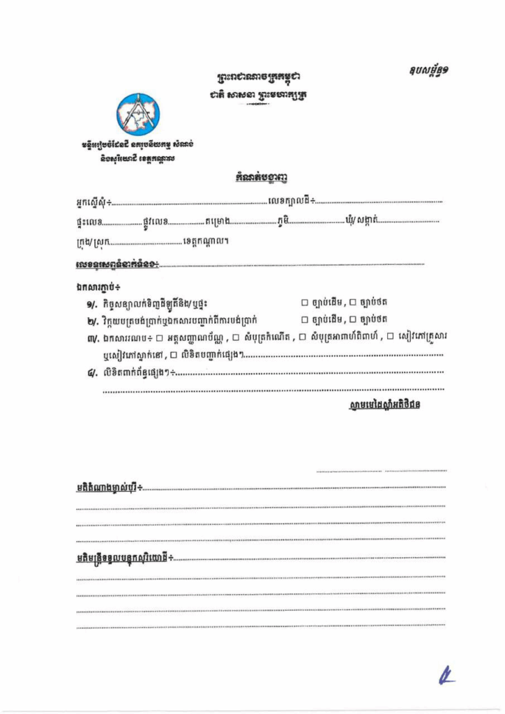 ជាមួយគ្នានេះ អតិថិជន ក៏តម្រូវឲ្យភ្ជាប់មកជាមួយនូវឯកសារដូចជា៖ ១. កិច្ចសន្យាលក់ទិញដីឡូត៍និង/ឬផ្ទះ (ច្បាប់ដើម)។ ២. វិក្កយបត្របង់ប្រាក់ឬឯកសារបញ្ជាក់ពីការបង់ប្រាក់ (ច្បាប់ដើម)។ និង៣. ឯកសារពាក់ព័ន្ធនឹងការស្នើសុំចុះបញ្ជីផ្ទេរកម្មសិទ្ធិ។