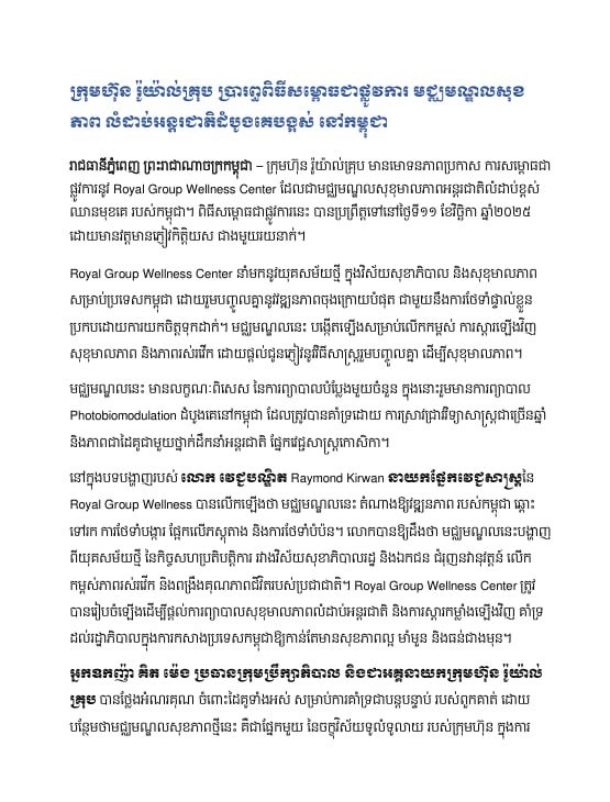 រាជធានីភ្នំពេញ៖ ក្រុមហ៊ុន រ៉ូយ៉ាល់គ្រុប របស់អ្នកឧកញ៉ា គិត ម៉េង មានមោទនភាពប្រកាសការសម្ពោធជាផ្លូវការនូវ Royal Group Wellness Center ដែលជាមជ្ឈមណ្ឌលសុខុមាលភាពអន្តរជាតិលំដាប់ខ្ពស់ឈានមុខគេរបស់កម្ពុជា។ ពិធីសម្ពោធជាផ្លូវការនេះ បានប្រព្រឹត្តទៅនៅថ្ងៃទី១១ ខែវិច្ឆិកា ឆ្នាំ២០២៥ ក្រោមអធិបតីភាព ឯកឧត្តមបណ្ឌិត Shaharuddin Onn ឯកអគ្គរាជទូតម៉ាឡេស៊ី ប្រចាំនៅព្រះរាជាណាក្រកម្ពុជា និងអ្នកឧកញ៉ា គិត ម៉េង ប្រធានក្រុមប្រឹក្សាភិបាល និងជាអគ្គនាយកក្រុមហ៊ុន រ៉ូយ៉ាល់ គ្រុប រួមជាមួយលោកជំទាវអ្នកឧកញ៉ា ម៉ៅ ចំណាន គិតម៉េង អនុប្រធានក្រុមប្រឹក្សាភិបាលក្រុមហ៊ុន រ៉ូយ៉ាល់ គ្រុប និងជាប្រធានសមាគមសិល្បករខ្មែរ ព្រមទាំងមានការអញ្ជើញចូលរួមពី ភ្ញៀវកិត្តិយសជាតិ និងអន្តរជាតិ ជាច្រើនរូប។