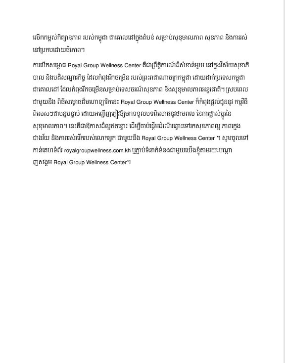 សូមជម្រាបថា ស្របពេលជាមួយនឹងពិធីសម្ពោធដ៏មហោឡារិកនេះ Royal Group Wellness Center ក៏កំពុងផ្តល់ជូននូវកម្មវិធីពិសេសៗ ជាបន្តបន្ទាប់ ដោយអញ្ជើញភ្ញៀវឱ្យមកទទួលបទពិសោធន៍នូវថាមពល នៃការផ្លាស់ប្តូរនៃសុខុមាលភាព។ នេះគឺជាឱកាសដ៏ល្អឥតខ្ចោះ ដើម្បីចាប់ផ្តើមដំណើរឆ្ពោះទៅរកសុខភាពល្អ ភាពក្មេងជាងវ័យ និងភាពរស់រវើករបស់លោកអ្នកជាមួយនឹង Royal Group Wellness Center៕