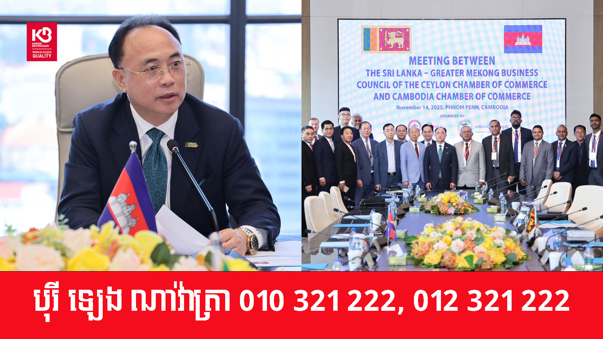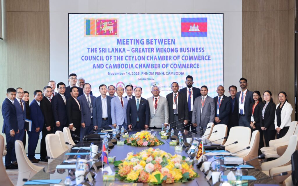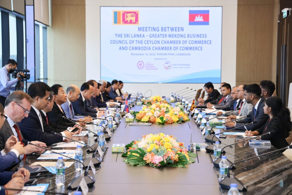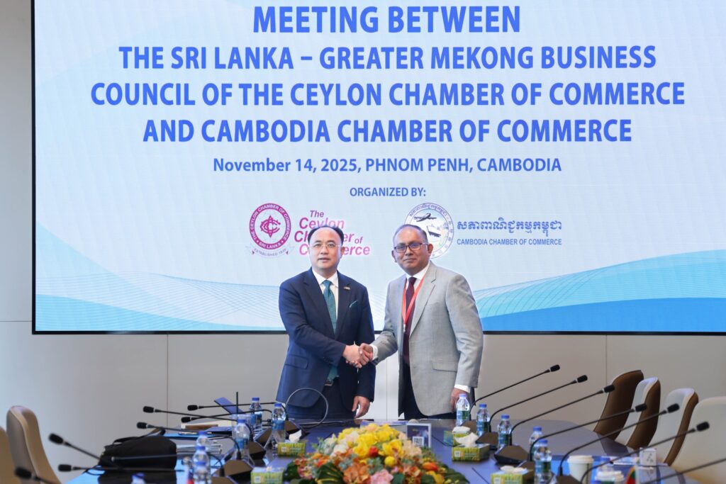 នារសៀលថ្ងៃទី១៤ ខែវិច្ឆិកា ឆ្នាំ២០២៥ អ្នកឧកញ៉ា គិត ម៉េង ប្រធានសភាពាណិជ្ជកម្មកម្ពុជា និងជាប្រធានក្រុមប្រឹក្សាពិគ្រោះយោបល់ធុរកិច្ចអាស៊ានសម្រាប់កម្ពុជា បានទទួលជួបពិភាក្សាការងារជាមួយគណៈប្រតិភូធុរកិច្ចស្រីលង្កា ដែលដឹកនាំដោយ លោក ទីឡាក ហ្គូណាវ៉ាដាណា (Tilak Gunawardana) អនុប្រធានជាន់ខ្ពស់នៃក្រុមប្រឹក្សាធុរកិច្ចស្រីលង្កា-មេគង្គនៃសភាពាណិជ្ជកម្មស៊ីលុន (Ceylon Chamber of Commerce)។ កិច្ចពិភាក្សានេះបានផ្តោតសំខាន់ទៅលើការជំរុញពាណិជ្ជកម្ម និងវិនិយោគរវាងប្រទេសទាំងពីរ ពិសេសគឺលើវិស័យសក្តានុពលរួម៖ កម្មន្តសាល ភស្តុភារ សំណង់និងអចលនទ្រព្យ ថាមពល និង ទេសចរណ៍ និងសេវាកម្ម។