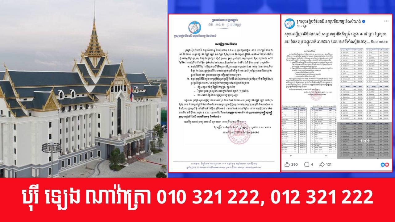 ក្រសួងរៀបចំដែនដី នគរូបនីយកម្ម និងសំណង់ នៅថ្ងៃទី២១ ខែវិច្ឆិកា ឆ្នាំ២០២៥ បានចេញសេចក្តីប្រកាសព័ត៌មានអញ្ជើញអតិថិជនរបស់ គម្រោងផ្ទះនិងដីឡូត៍ ឡេង ណាវ៉ាត្រា ជ្រែមួយរយ និងគម្រោងផ្លូវជាតិលេខ៦អា ដែលមានទីតាំងស្ថិតនៅភូមិជ្រែមួយរយ និងភូមិអន្លង់ស្លែង ឃុំសំបួរមាស ស្រុកមុខកំពូល ខេត្តកណ្តាល ទៅបន្តនីតិវិធីចុះបញ្ជីផ្ទេរកម្មសិទ្ធិ និងទទួលវិញ្ញាបនបត្រសម្គាល់ម្ចាស់អចលនវត្ថុ ដំណាក់កាលទី៣ ចំនួន ២៤៦៣បណ្ណ ចាប់ពីថ្ងៃទី២៧ ដល់ថ្ងៃទី២៩ ខែវិឆ្ឆិកា ឆ្នាំ២០២៥ រៀងរាល់ម៉ោងធ្វើការ នៅទីស្តីការក្រសួង។