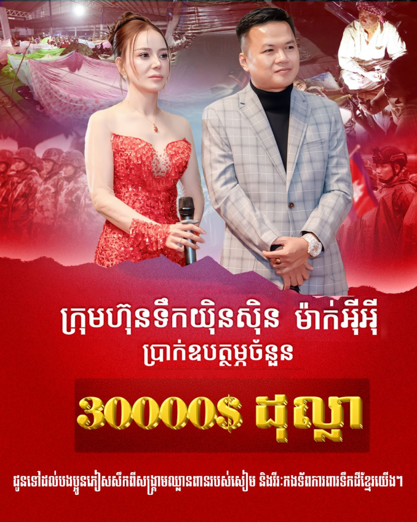 លោកឧកញ៉ា យឹម តាស្រង់ អគ្គនាយកក្រុមហ៊ុនទឹកយិនស៊ិន ម៉ាក់អ៊ីអ៊ី និងលោកជំទាវ បានប្រកាសចូលរួមឧបត្ថម្ភថវិកា ៣ម៉ឺនដុល្លារ ជួយដល់កងទ័ពជួរមុខកម្ពុជា និងជនភៀសសឹកពីការឈ្លានពានរបស់ចោរសៀម។