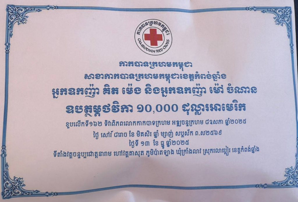 នៅក្នុងឱកាសខួបលើកទី១៦២ ទិវាពិភពលោកកាកបាទក្រហម អឌ្ឍចន្ទក្រហម ៨ឧសភា ២០២៥ អ្នកឧកញ៉ា គិត ម៉េង និងលោកជំទាវ អ្នកឧកញ៉ា ម៉ៅ ចំណាន បានចូលរួមបរិច្ចាគថវិកាចំនួន១ម៉ឺនដុល្លារ ដល់សាខាកាកបាទក្រហមកម្ពុជា ខេត្ដកំពង់ឆ្នាំង ដែលប្រារព្ធធ្វើឡើងនៅថ្ងៃទី១៣ ខែធ្នូ ឆ្នាំ២០២៥នេះ នៅវត្តចន្ទប្បជោត្ដរាម ហៅវត្ដតាសុត ភូមិប៉ាតឡាង ឃុំក្រាំងលាវ ស្រុករលាប្អៀង ខេត្ដកំពង់ឆ្នាំង។