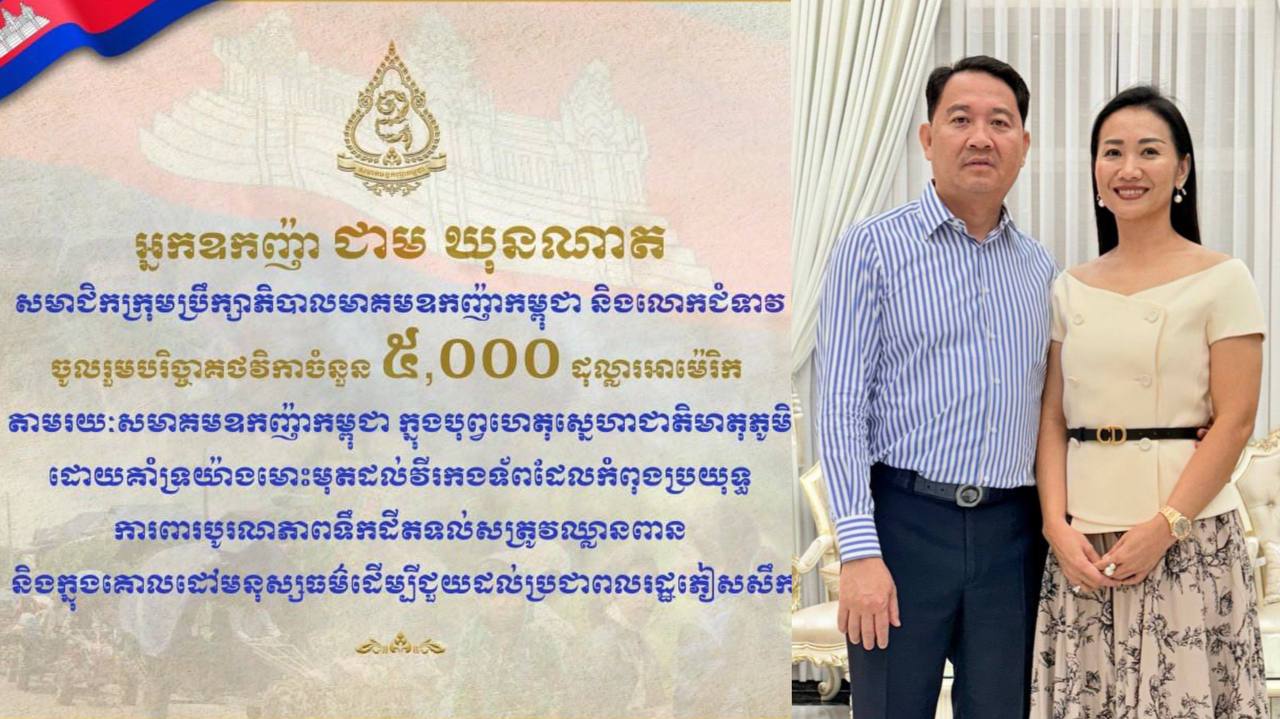 អ្នកឧកញ៉ា ជាម ឃុនណាត សមាជិកក្រុមប្រឹក្សាភិបាល នៃសមាគមឧកញ៉ាកម្ពុជា និងលោកជំទាវ បានចូលរួមបរិច្ចាគថវិកាចំនួន ៥,០០០ ដុល្លារអាម៉េរិក តាមរយៈសមាគមឧកញ៉ាកម្ពុជា ក្នុងបុព្វហេតុសេ្នហាជាតិមាតុភូមិដោយគាំទ្រយ៉ាងមោះមុតដល់វីរកងទ័ពដែលកំពុងប្រយុទ្ធការពារបូរណភាពទឹកដីតទល់សត្រូវឈ្លានពាន និងក្នុងគោលដៅមនុស្សធម៌ដើម្បីជួយដល់ប្រជាពលរដ្ឋភៀសសឹកពីតំបន់ជម្លោះ។