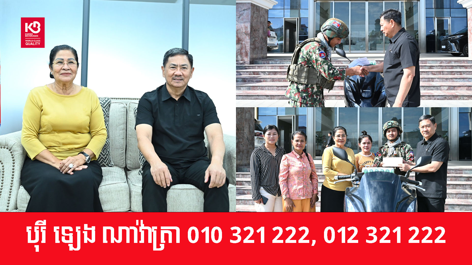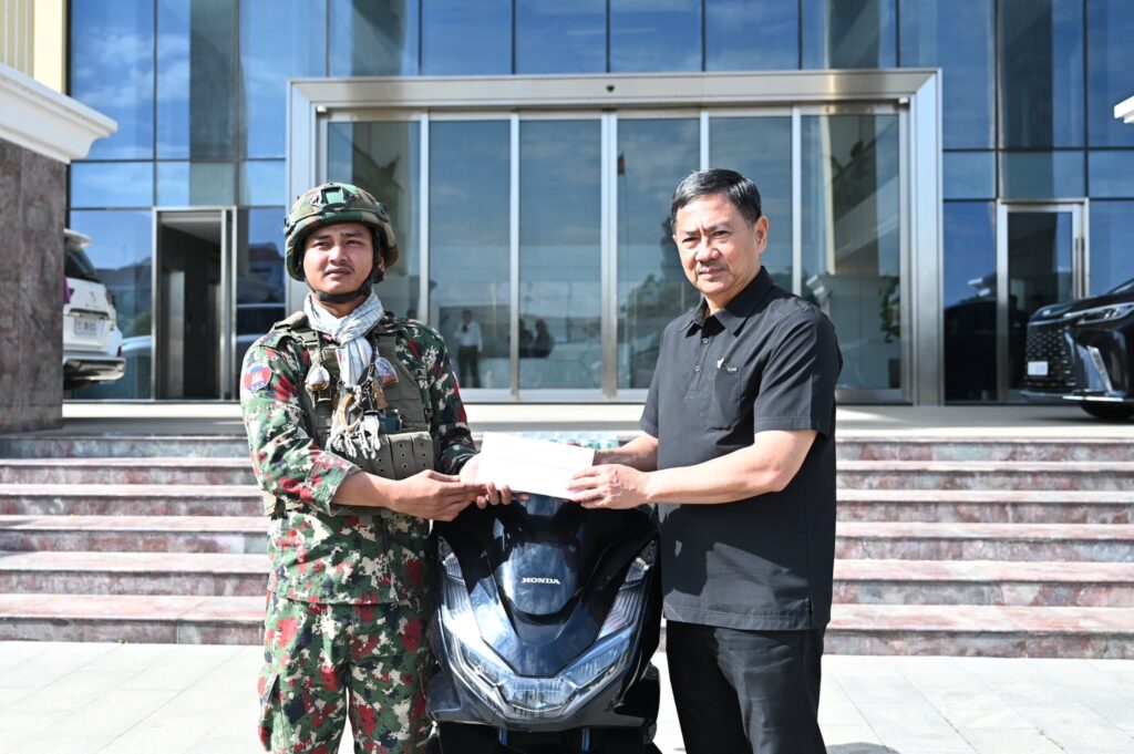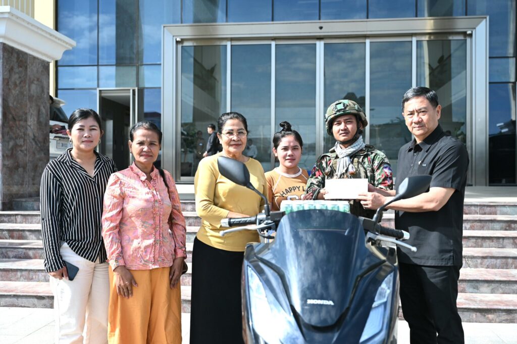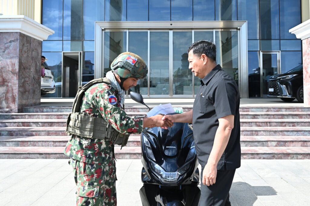 នាព្រឹកថ្ងៃទី៥ ខែមករា ឆ្នាំ២០២៦ ឯកឧត្តម ឧត្តមសេនីយ៍ឯក ជួន ណារិន្ទ អគ្គស្នងការរង និងជាស្នងការនគរបាលរាជធានីភ្នំពេញ និងលោកជំទាវឧកញ៉ា ហ៊ុន ស៊ីណាត បានអញ្ជើញជួបសំណេះសំណាល និងប្រគល់ម៉ូតូ ០១គ្រឿង ជូនដល់វីរកងទ័ព ក្រោយពីម្ចាស់ហាងបញ្ចាំម៉ូតូបានប្រគល់ម៉ូតូ០១គ្រឿងនេះដល់វីរៈកងទ័ពវិញ។