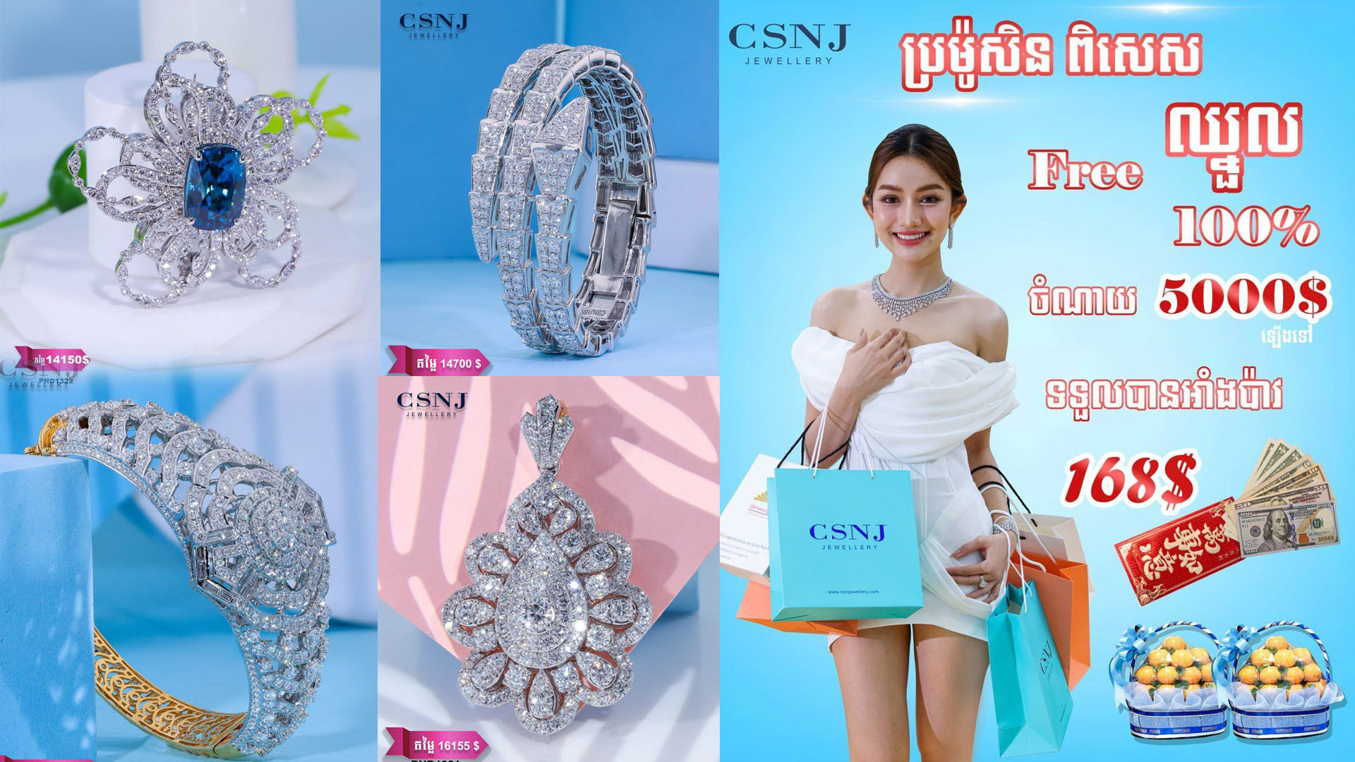 សូមជម្រាបជូនថា ហាងពេជ្រ CSNJ មានលក់ និងទទួលកុម្ម៉ង់ធ្វើគ្រឿងអលង្ការម៉ូដស្អាតប្លែកជាច្រើនប្រភេទ តាមការចង់បានរបស់អតិថិជន ជាពិសេសមានលក់ឈុតគ្រឿងអលង្ការពេជ្រគ្រប់ទំហំ គ្រប់លី ក្នុងតម្លៃសមរម្យ ។ ក្រៅពីនោះ ហាង CSNJ ក៏មានលក់ទាំងប្រភេទខ្សែកអ៊ីតាលី មាសគីឡូដុំ ត្បូងមានតម្លៃរបស់ខ្មែរគ្រប់ប្រភេទ ដែលមានតម្លៃសមរម្យ។ មិនត្រឹមតែប៉ុណ្ណោះ ហាងពេជ្រ CSNJ របស់លោកឧកញ៉ា ចិន សំណាង និងលោកឧកញ៉ាផ្ទាល់ ក្នុងនាមជាអ្នកច្នៃម៉ូដជំនាញរាប់ឆ្នាំខ្លួនឯងផង និងជាអ្នកជំនួញក្នុងវិស័យគ្រឿងអលង្ការផង លោកឧកញ៉ា ក៏មានបណ្ដាញប្រភពគ្រឿងអលង្ការធំៗ ថ្លៃៗ ជាមួយដៃគូជំនួញនៅតាមបណ្តាប្រទេសមួយចំនួន ដូចជា ដៃគូនៅប្រទេសអ៊ីតាលី អាល្លឺម៉ង់ និងហុងកុងជាដើម ដែលធ្វើឲ្យហាងកាន់តែមានអតិថិជនមកគាំទ្រច្រើនទៅៗ ស្របពេលអតិថិជនទទួលបាននូវគ្រឿងអលង្ការគុណភាពខ្ពស់ និងទឹកដៃជាងច្នៃម៉ូដដ៏ល្អឯកដាច់គេលំដាប់ប្រទេស។