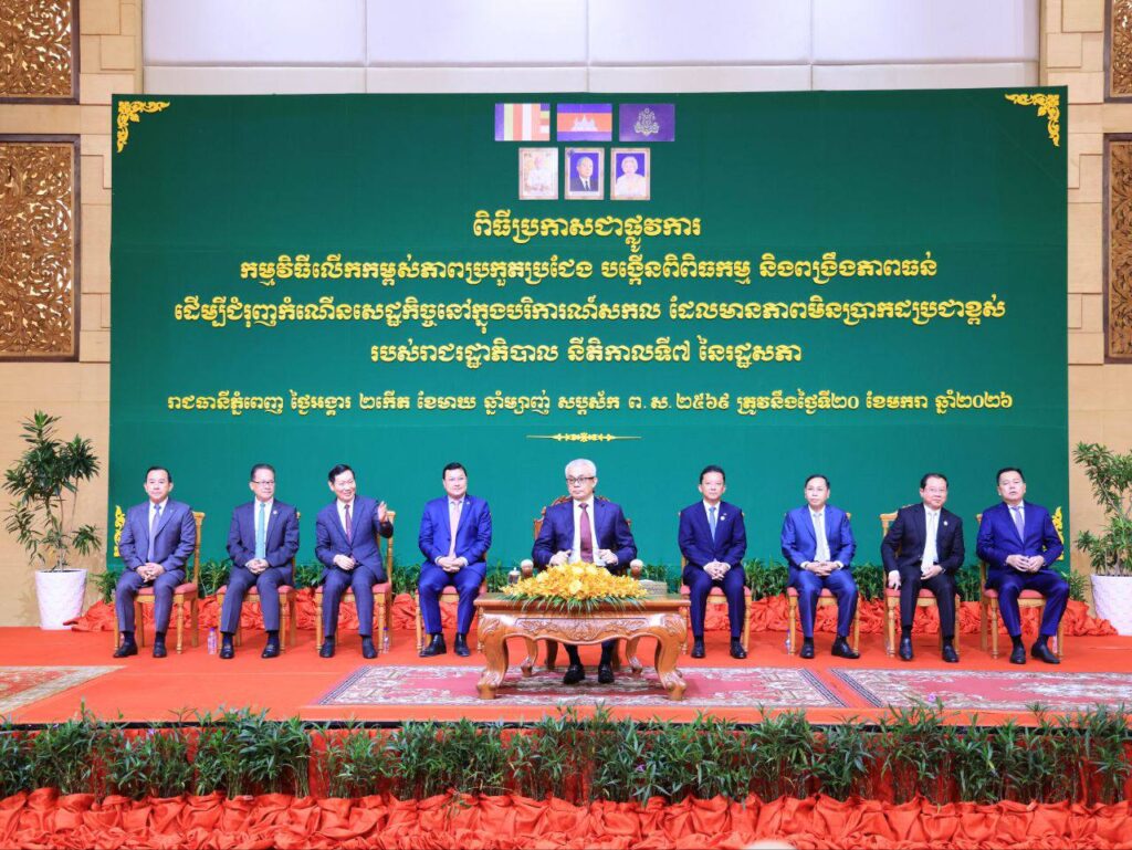 នាព្រឹកថ្ងៃអង្គារ ទី២០ ខែមករា ឆ្នាំ២០២៦ នៅសណ្ឋារគារ សុខា រ៉េស៊ីដិន, ឧកញ៉ា គួច ផេង អនុប្រធានសភាពាណិជ្ជកម្មកម្ពុជា និងជាសហប្រធានក្រុមការងារ “ឆ” ផ្នែកឯកជន តំណាង អ្នកឧកញ៉ា គិត ម៉េង ប្រធានសភាពាណិជ្ជកម្មកម្ពុជា និងជាប្រធានគណៈកម្មការសម្របសម្រួលក្រុមការងារផ្នែកឯកជន សម្រាប់យន្តការវេទិការាជរដ្ឋាភិបាល-ផ្នែកឯកជន (គ.ស.ឯ.រ.ជ ) អមដោយអនុប្រធានសភាពាណិជ្ជកម្មកម្ពុជា និងសមាជិកពាក់ព័ន្ធផ្សេងទៀត បានអញ្ជើញចូលរួមក្នុង ពិធីប្រកាសជាផ្លូវការ “កម្មវិធីលើកកម្ពស់ភាពប្រកួតប្រជែង បង្កើនពិពិធកម្ម និងពង្រឹងភាពធន់ ដើម្បីជំរុញកំណើនសេដ្ឋកិច្ច នៅក្នុងបរិការណ៍សកលដែលមានភាពមិនប្រាកដប្រជាខ្ពស់របស់រាជរដ្ឋាភិបាល នីតិកាលទី៧ នៃរដ្ឋសភា”។