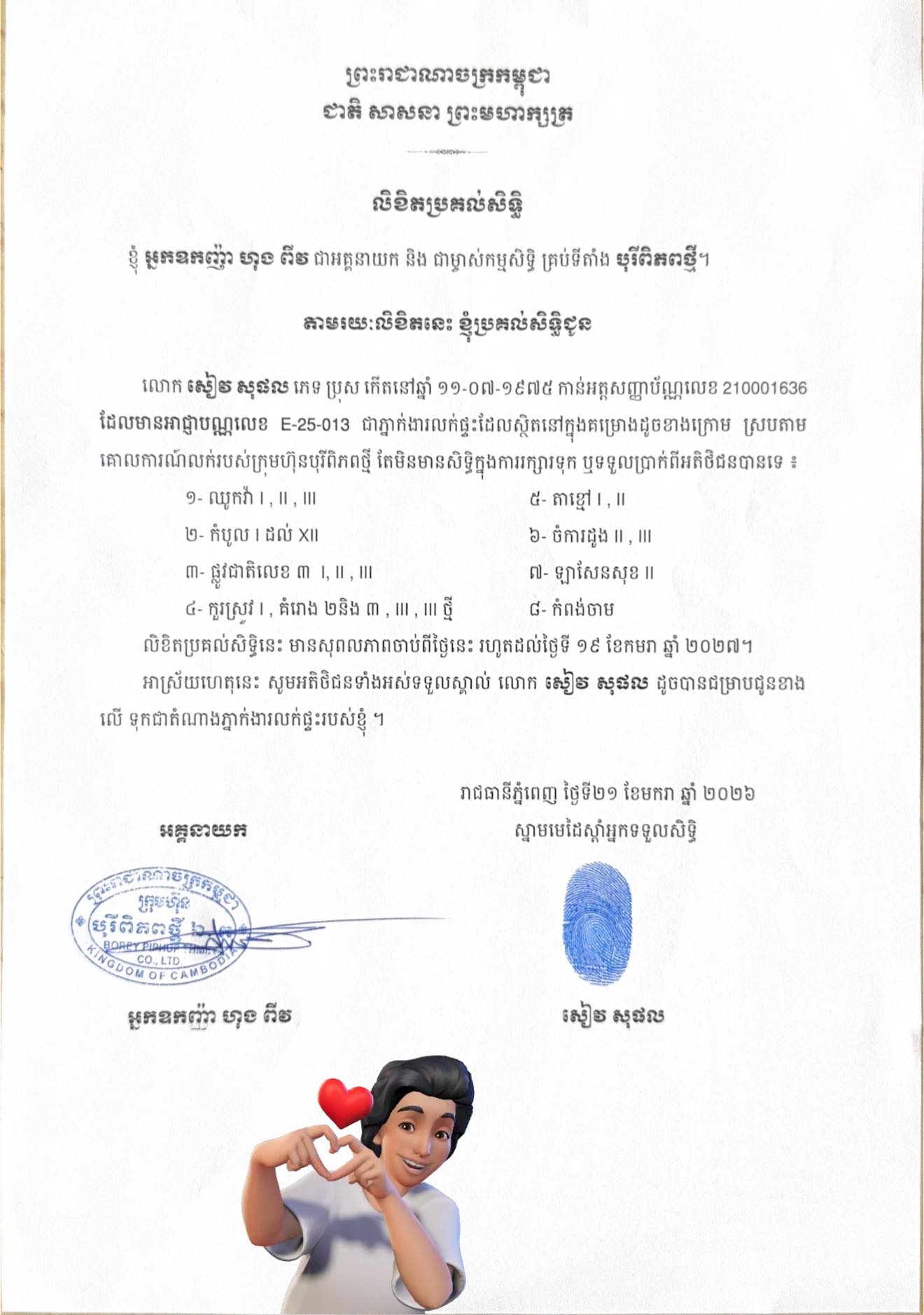 គួរបញ្ជាក់ថា លិខិតប្រគល់សិទ្ធិជូន លោក សៀវ សុផល ជាភ្នាក់ងារលក់នេះ មានសុពលភាពចាប់ពីថ្ងៃនេះ រហូតដល់ថ្ងៃទី ១៩ ខែមករា ឆ្នាំ២០២៧៕