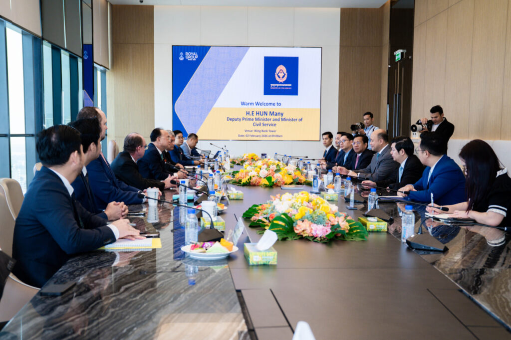 អ្នកឧកញ៉ា គិត ម៉េង ប្រធានក្រុមប្រឹក្សាភិបាល ធនាគារ វីង និងជាអគ្គនាយកប្រតិបត្តិក្រុមហ៊ុន រ៉ូយ៉ាល់គ្រុប ព្រមទាំងគណៈគ្រប់គ្រងធនាគារវីង នៅព្រឹកថ្ងៃទី០២ ខែកុម្ភៈ ឆ្នាំ២០២៦ បានអញ្ជើញទទួលដំណើរ ឧបនាយករដ្ឋមន្ត្រី ហ៊ុន ម៉ានី ដែលបានដឹកនាំគណៈប្រតិភូ នៃក្រសួងមុខងារសាធារណៈ អញ្ជើញទស្សនកិច្ច នៅអគារធនាគារ «វីង»។