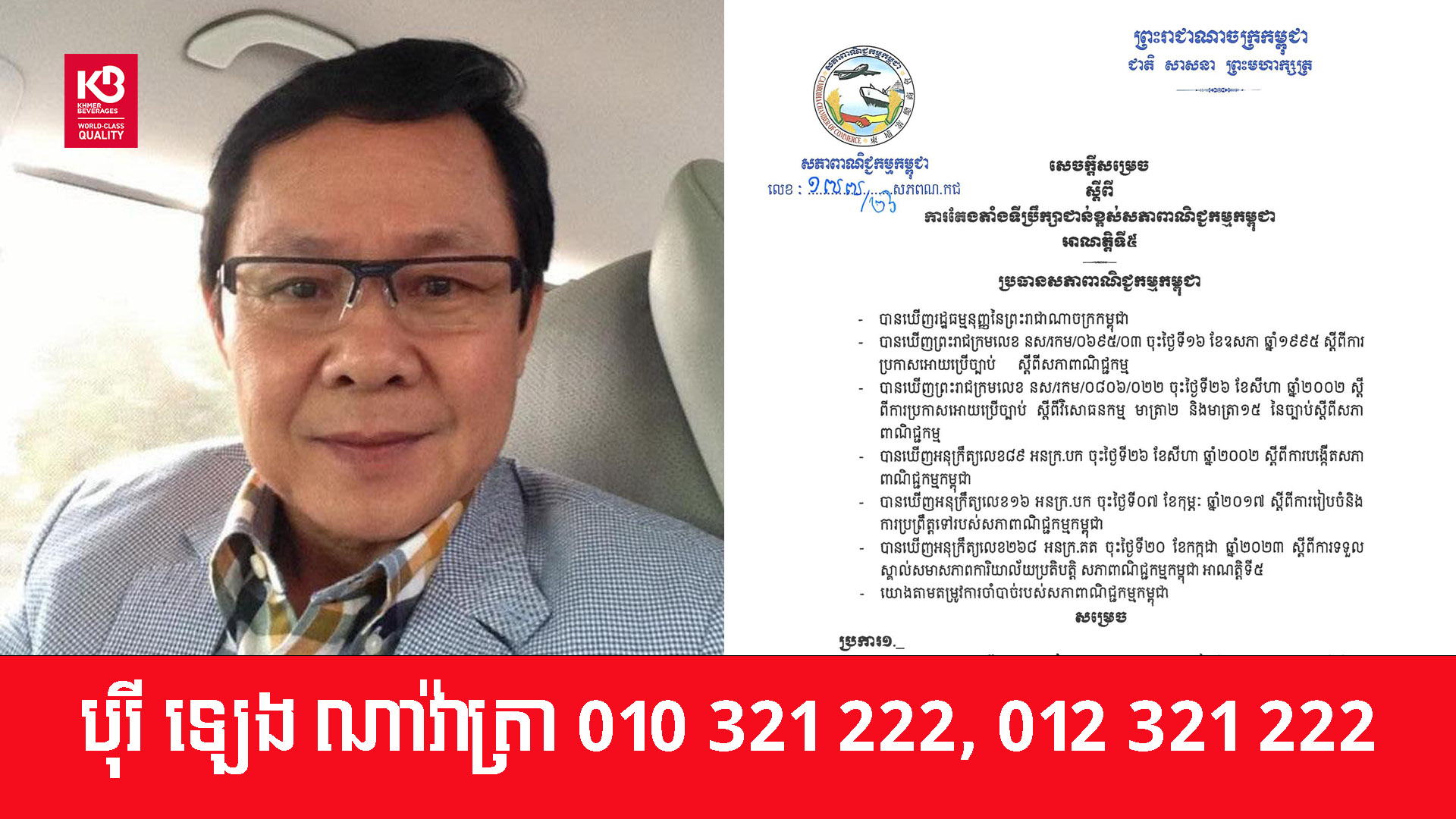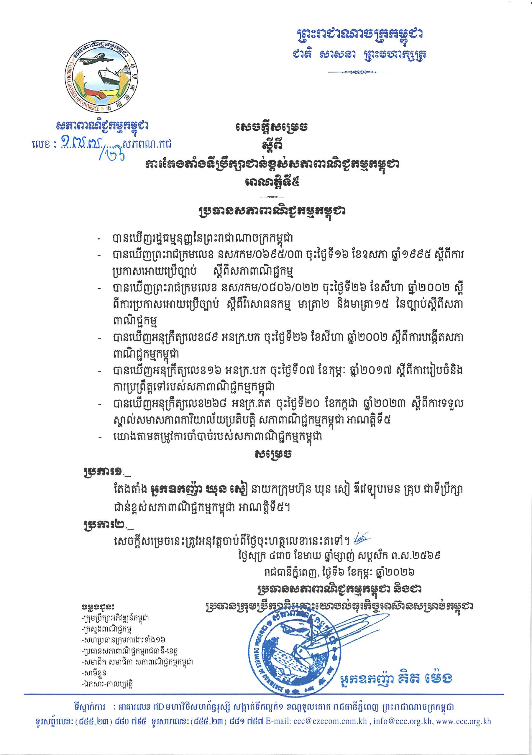 អ្នកឧកញ៉ា គិត ម៉េង ប្រធានសភាពាណិជ្ជកម្មកម្ពុជា និងជាប្រធានក្រុមប្រឹក្សាពិគ្រោះយោបល់ធុរកិច្ច​អាស៊ាន​សម្រាប់កម្ពុជា បានចេញសេចក្ដីសម្រេចតែងតាំង អ្នកឧកញ៉ា ឃុន សៀ នាយកក្រុមហ៊ុន ឃុន សៀ ឌីវេឡុ​បមេន គ្រុប (Khun Sea Development Group Co., Ltd) ជាទីប្រឹក្សាជាន់ខ្ពស់សភាពាណិជ្ជកម្មកម្ពុជា អាណត្ដិទី៥ នៅថ្ងៃទី០៦ ខែកុម្ភៈ ឆ្នាំ២០២៦។