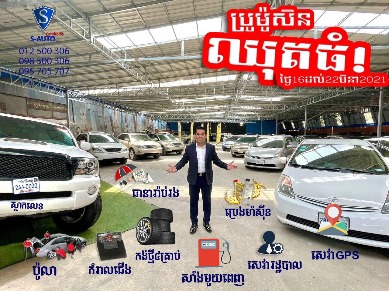 ប្រូម៉ូសិនឈុតធំ តបតាមសំណូមពររបស់អតិថិជនរបស់ S-Auto ទិញលក់រថយន្ត រួមមាន៖ ១. ថែមជូនការធ្វើស្លាកលេខ ២. Free សេវារដ្ឋបាល ៣. Free កំរាលជើង ៤. Free ធានារ៉ាប់រង ៥. Free ប៉ូលា ៦. Free សេវា GPS ៧. Free ប្តូរប្រេងម៉ាសុីន ៨. Free បោកពូកលាងម៉ាសុីន ៩. Free ចាក់សាំងមួយពេញ ១០. Free កង់ថ្មី ៤គ្រាប់ ។