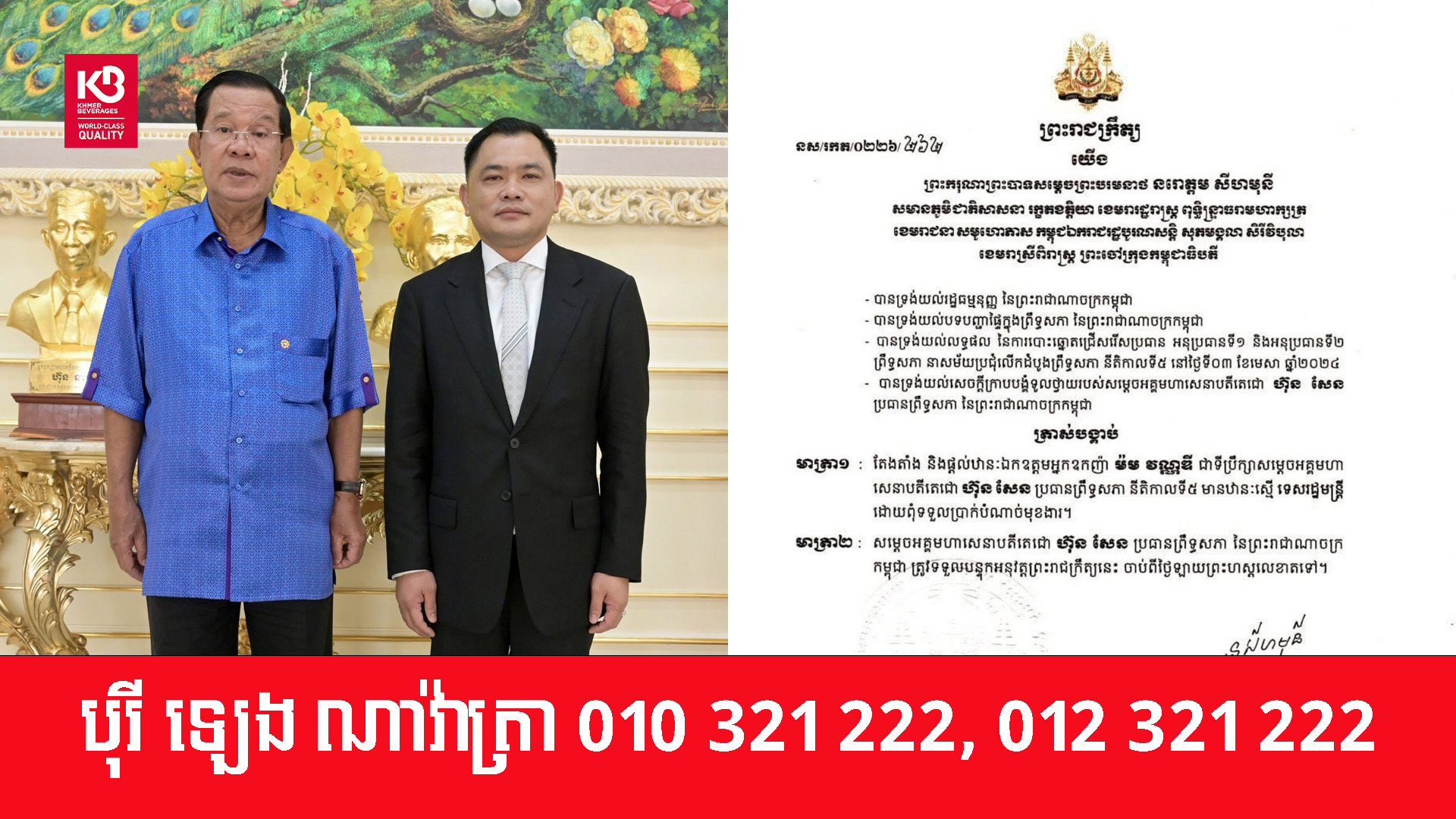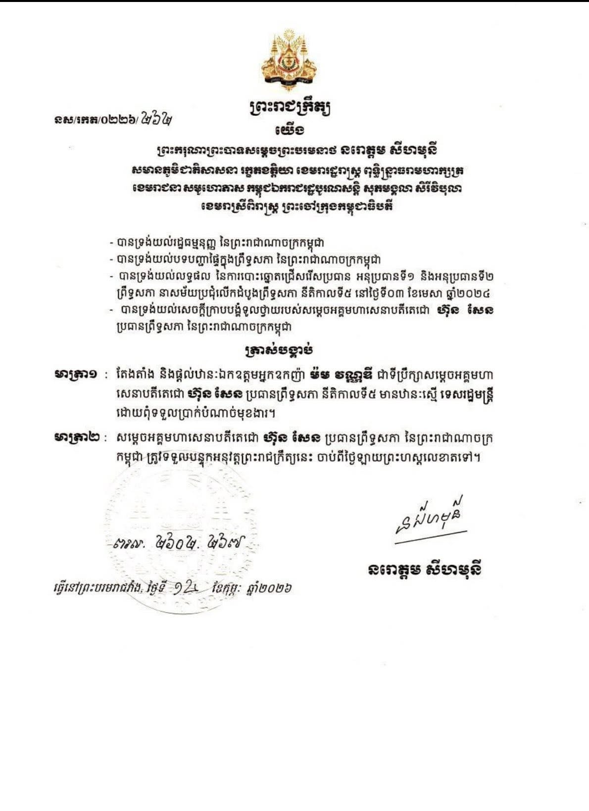 ព្រះករុណាព្រះបាទសម្ដេចព្រះបរមនាថ នរោត្តម សីហមុនី ព្រះមហាក្សត្រនៃព្រះរាជាណាចក្រកម្ពុជា បានចេញព្រះរាជក្រឹត្យត្រាស់បង្គាប់តែងតាំង និងផ្ដល់ឋានៈ អ្នកឧកញ៉ា ម៉ម វណ្ណឌី ជាទីប្រឹក្សាសម្តេចតេជោ ហ៊ុន សែន ប្រធានព្រឹទ្ធសភា នីតិកាលទី៥ មានឋានៈស្មើ ទេសរដ្ឋមន្ត្រី ដោយពុំទទួលប្រាក់បំណាច់មុខងារ នៅថ្ងៃទី១៤ ខែកុម្ភៈ ឆ្នាំ២០២៦។