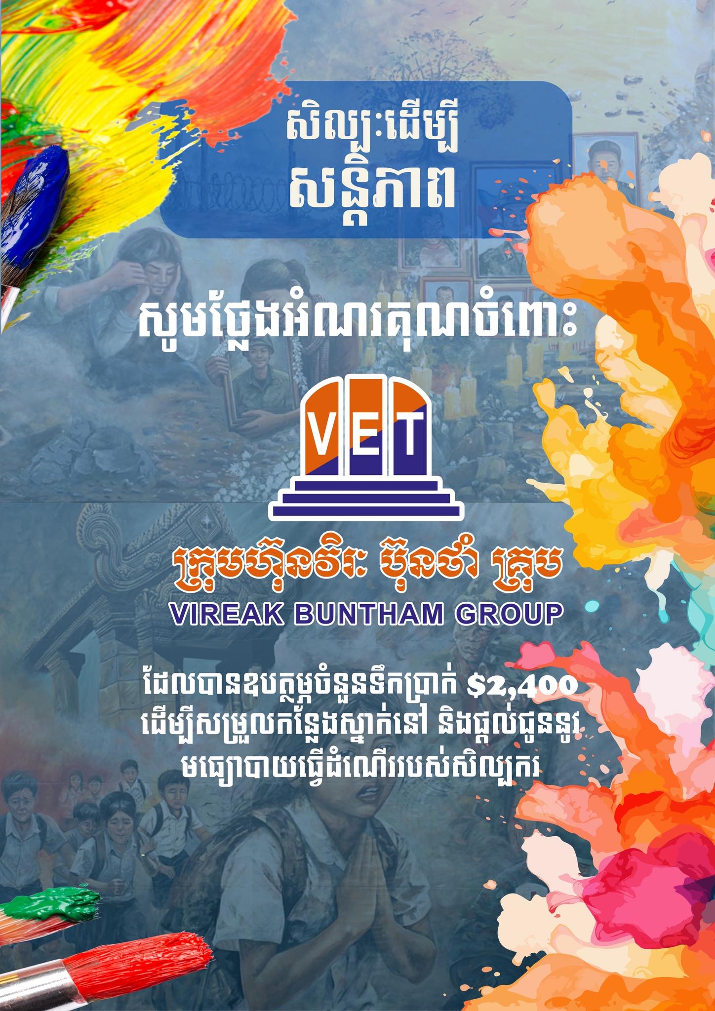 អ្នកឧកញ៉ាបណ្ឌិត សួរ វីរៈ អគ្គនាយកក្រុមហ៊ុន វិរៈ ប៊ុនថាំ ចូលរួមគាំទ្រយ៉ាងពេញទំហឹង និងចូលរួមឧបត្ថម្ភទឹកប្រាក់ចំនួន ២,៤០០ដុល្លារ ដល់ផ្ទាំងគំនូរសិល្បះដើម្បីសន្តិភាពលើកទី២ រាជធានីភ្នំពេញ ដែលមានប្រវែងទទឹង រហូតដល់៣៥ម៉ែត្រ និងកំពស់៥ម៉ែត្រ ក្រោមស្នាដៃវិចិត្រករកូនខ្មែរជាច្រើនរូប។