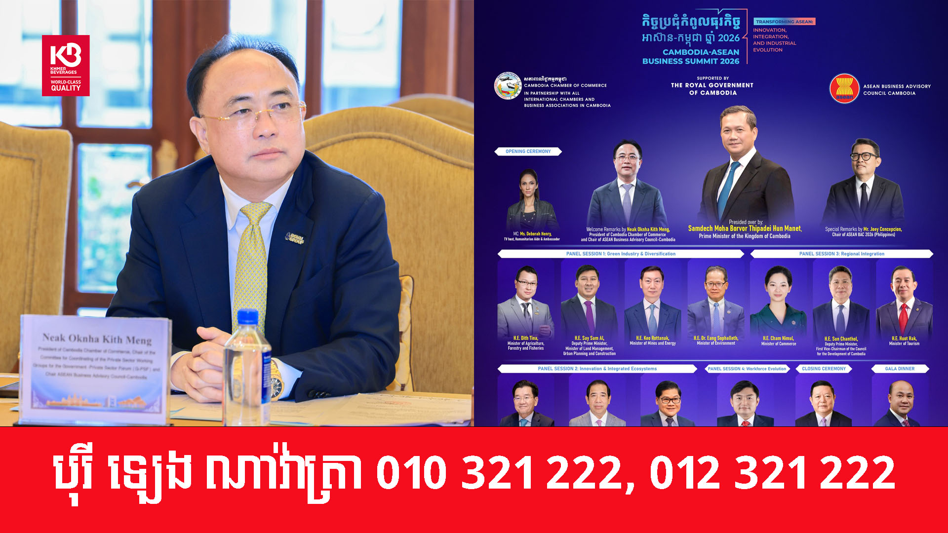 អ្នកឧកញ៉ា គិត ម៉េង ប្រធានសភាពាណិជ្ជកម្មកម្ពុជា និងជាប្រធានក្រុមប្រឹក្សាពិគ្រោះយោបល់ធុរកិច្ចអាស៊ានសម្រាប់កម្ពុជា នឹងអញ្ជើញថ្លែងសុន្ទរកថាស្វាគមន៍ក្នុង «កិច្ចប្រជុំកំពូលធុរកិច្ចអាស៊ាន-កម្ពុជាឆ្នាំ២០២៦» ដែលនឹងប្រព្រឹត្តទៅ នាថ្ងៃទី៤ ខែមីនា ឆ្នាំ២០២៦ នៅ សណ្ឋាគារ សូហ្វីតែល ភ្នំពេញ ភូគីត្រា។