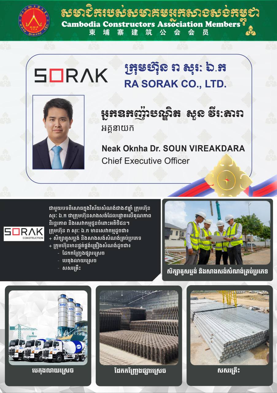 ក្រុមហ៊ុន រា សុរៈ ឯ.ក (RA Sorak Co., Ltd) របស់អ្នកឧកញ៉ា សួន វីរៈតារា បានចូលជាសមាជិកសមាគមអ្នកសាងសង់កម្ពុជា និងតែងតែជួយគាំទ្រដល់សមាគម នាពេលកន្លងមក។ នេះបើតាមការបង្ហាញរបស់សមាគមអ្នកសាងសង់កម្ពុជា នៅលើបណ្តាញសង្គម នាថ្ងៃទី០២ ខែមីនា ឆ្នាំ២០២៦។
