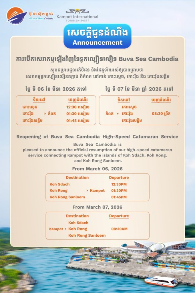ក្រុមហ៊ុនទូកល្បឿនលឿន ប៊ូ វ៉ា ស៊ី កម្ពុជា (Buva Sea Cambodia) នាថ្ងៃទី០៤ ខែមីនា ឆ្នាំ២០២៦នេះ បានចេញសេចក្ដីជូនដំណឹង ដល់អតិថិជន និងដៃគូទាំងអស់របស់ខ្លួនថា ចាប់ពីថ្ងៃទី០៦ ខែមីនា ឆ្នាំ២០២៦នេះ តទៅ ក្រុមហ៊ុននឹងបើកដំណើរការ សេវាកម្មទូកល្បឿនលឿន ដោយតភ្ជាប់ពីខេត្តកំពត ឆ្ពោះទៅកាន់ កោះស្តេច, កោះរ៉ុង និង កោះរ៉ុងសន្លឹម ឡើងវិញជាផ្លូវការ។