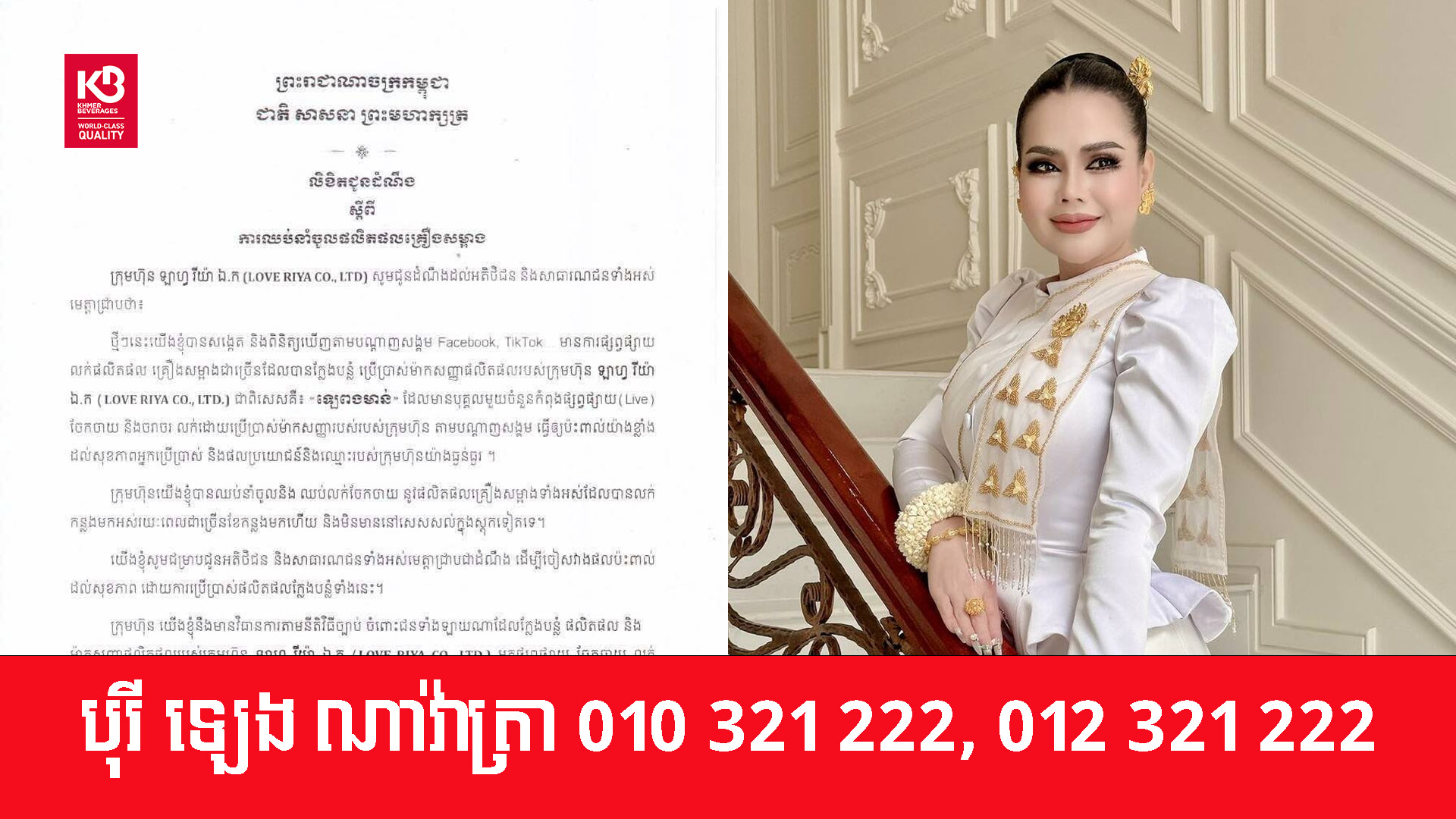 ក្រុមហ៊ុន ឡាហ្វ រីយ៉ា ឯ.ក (Love Riya Co., Ltd) របស់អ្នកនាង ឆេង ស្រីរ័ត្ន បានប្រកាសឈប់នាំចូលផលិតផលគ្រឿងសម្អាងទាំងអស់។ នេះបើតាមលិខិតជូនដំណឹង ចុះថ្ងៃទី០៣ ខែកុម្ភៈ ឆ្នាំ២០២៦។