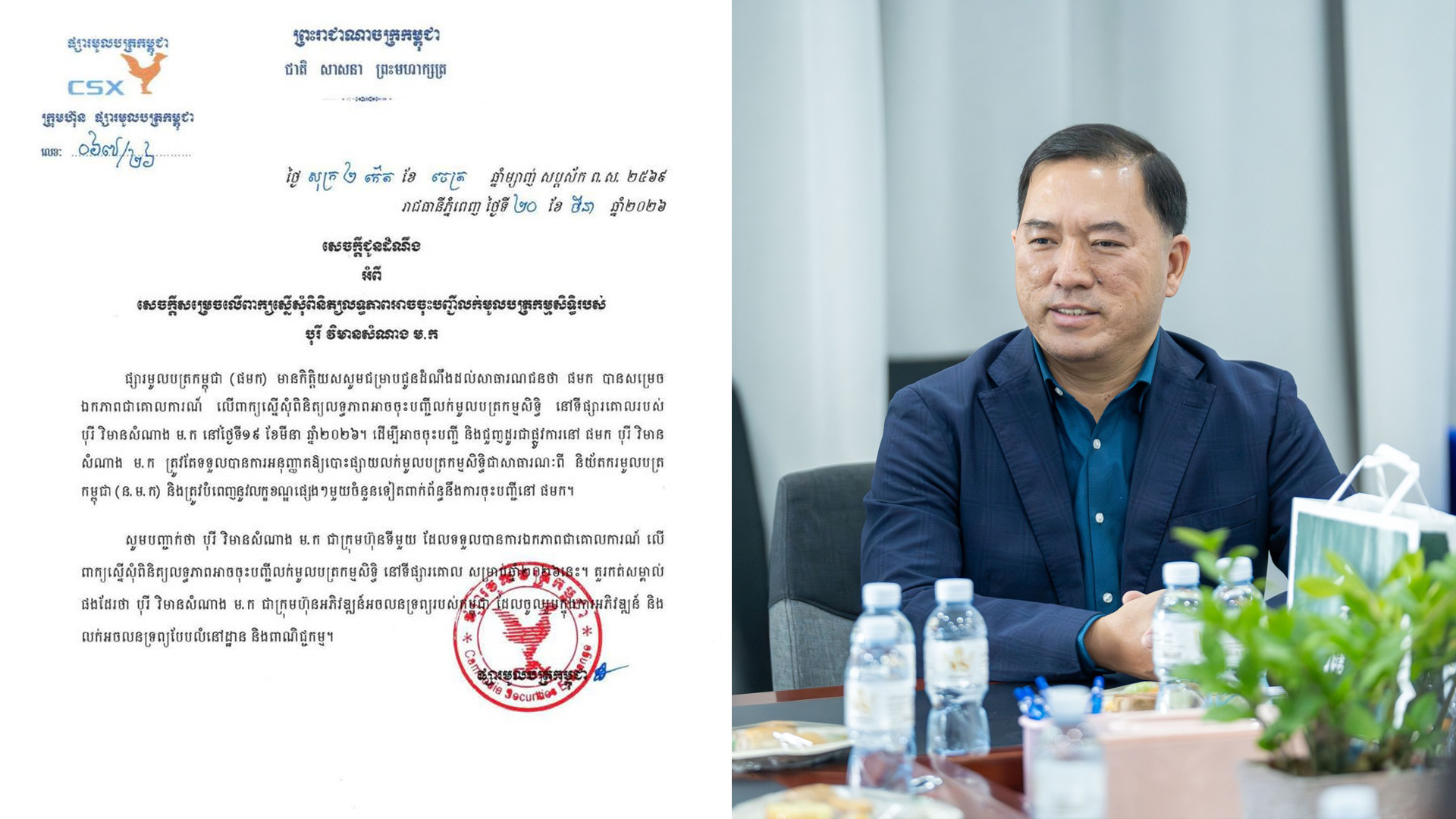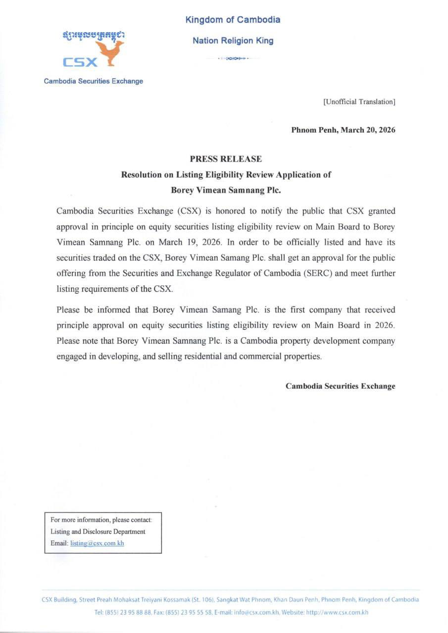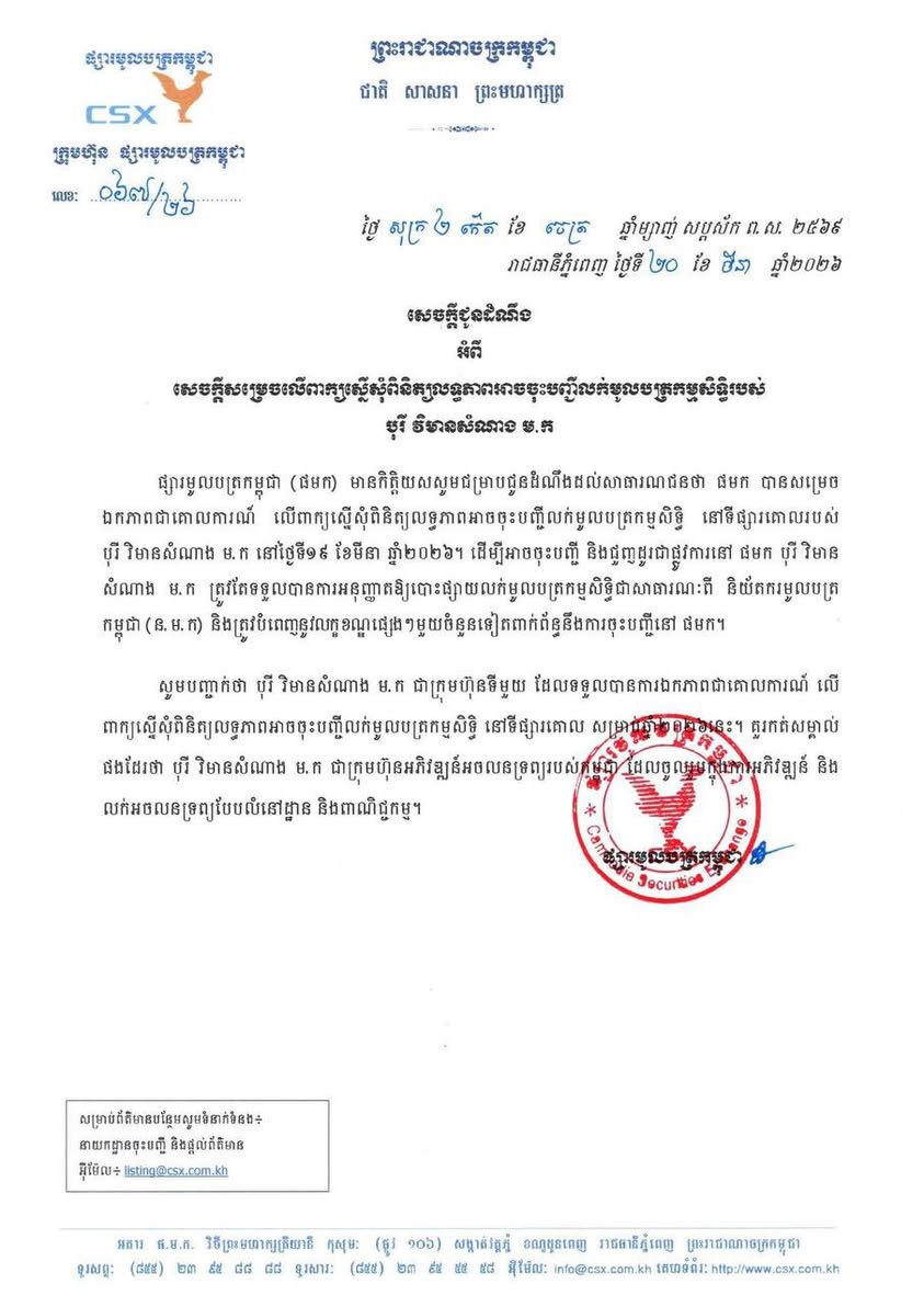 យោងតាមសេចក្តីជូនដំណឹងរបស់ផ្សារមូលបត្រកម្ពុជា បានឱ្យដឹងបែបនេះថា ផ្សារមូលបត្រកម្ពុជា (ផមក) មានកិត្តិយសសូមជម្រាបជូនដំណឹងដល់សាធារណជនថា ផមក បានសម្រេចឯកភាពជាគោលការណ៍ លើពាក្យស្នើសុំពិនិត្យលទ្ធភាពអាចចុះបញ្ជីលក់មូលបត្រកម្មសិទ្ធិ នៅទីផ្សារគោលរបស់ បុរី វិមានសំណាង ម.ក នៅថ្ងៃទី១៩ ខែមីនា ឆ្នាំ២០២៦។ ដើម្បីអាចចុះបញ្ជី និងជួញដូរជាផ្លូវការនៅ ផមក បុរី វិមានសំណាង ម.ក ត្រូវតែទទួលបានការអនុញ្ញាតឱ្យបោះផ្សាយលក់មូលបត្រកម្មសិទ្ធិជាសាធារណៈពី និយ័តករមូលបត្រកម្ពុជា (ន.ម.ក) និងត្រូវបំពេញនូវលក្ខខណ្ឌផ្សេងៗមួយចំនួនទៀតពាក់ព័ន្ធនឹងការចុះបញ្ជីនៅ ផមក។