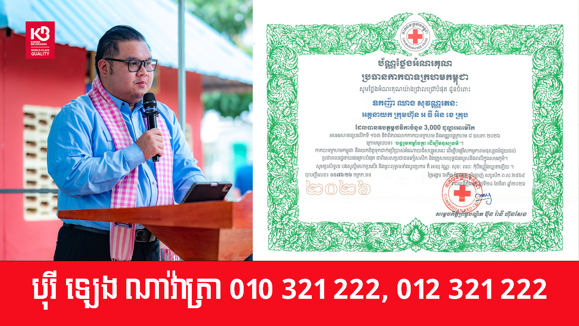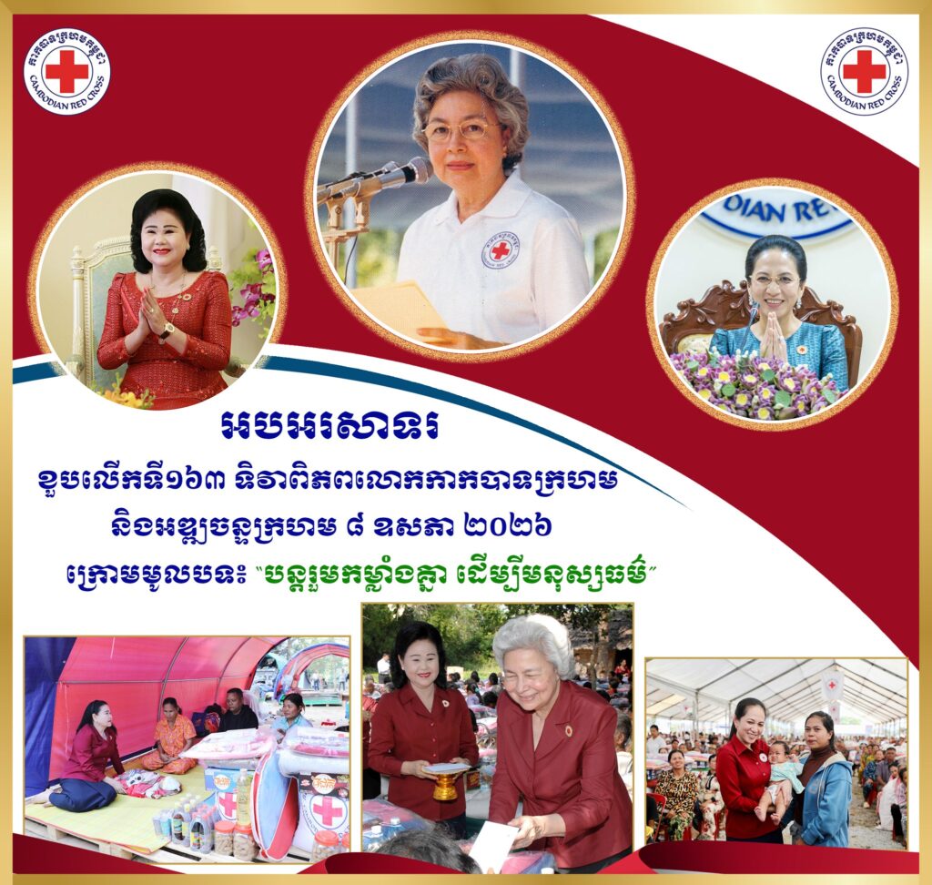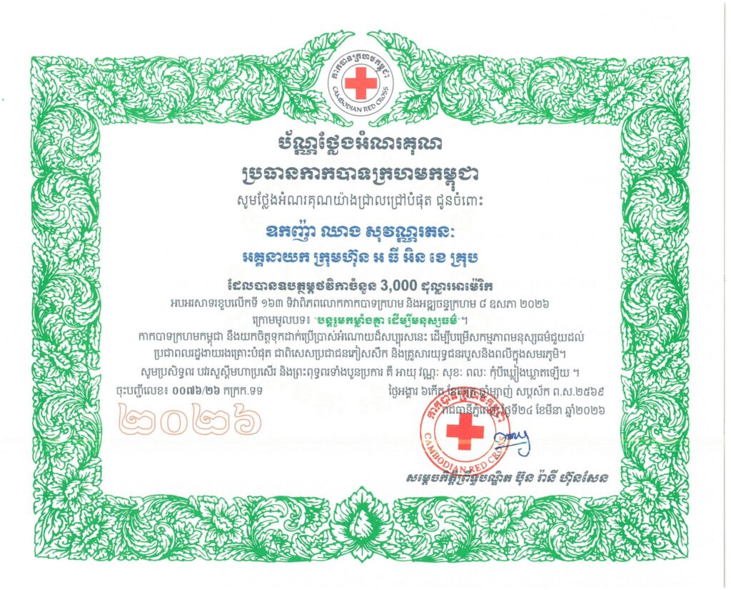 សម្តេចកិត្តិព្រឹទ្ធបណ្ឌិត ប៊ុន រ៉ានី ហ៊ុនសែន ប្រធានកាកបាទក្រហមកម្ពុជា សូមថ្លែងអំណរគុណយ៉ាងជ្រាលជ្រៅបំផុតចំពោះ ឧកញ៉ា ឈាង សុវណ្ណរតនៈ អគ្គនាយក ក្រុមហ៊ុន អ ធី អិន ខេ គ្រុប ដែលបានឧបត្ថម្ភថវិកា ៣,០០០ដុល្លារ (បីពាន់ដុល្លារអាម៉េរិក) ជូនកាកបាទក្រហមកម្ពុជា ក្នុងឱកាសខួបលើកទី១៦៣ ទិវាពិភពលោកកាកបាទក្រហម និងអឌ្ឍចន្ទក្រហម ៨ ឧសភា ឆ្នាំ២០២៦ ក្រោមមូលបទ «បន្តរួមកម្លាំងគ្នា ដើម្បីមនុស្សធម៌»។