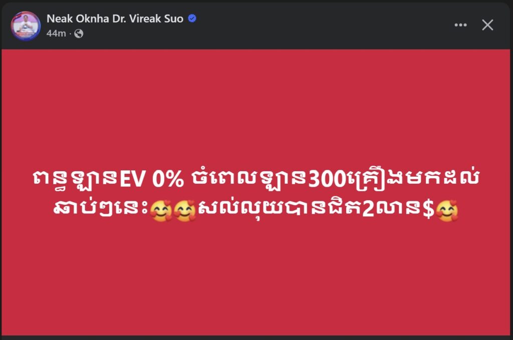 អ្នកឧកញ៉ាបណ្ឌិត សួរ វីរៈ អគ្គនាយកក្រុមហ៊ុន វិរៈ ប៊ុនថាំ អេចប្រេស បានបង្ហើបឱ្យដឹងថា លោកចំណេញថវិកាប្រមាណជិត ២លានដុល្លារអាមេរិក បន្ទាប់ពីរាជរដ្ឋាភិបាលកម្ពុជា ទម្លាក់អត្រាពន្ធ ០% (មិនគិតពន្ធ) លើការនាំចូលរថយន្តប្រភេទអគ្គិសនី EV។