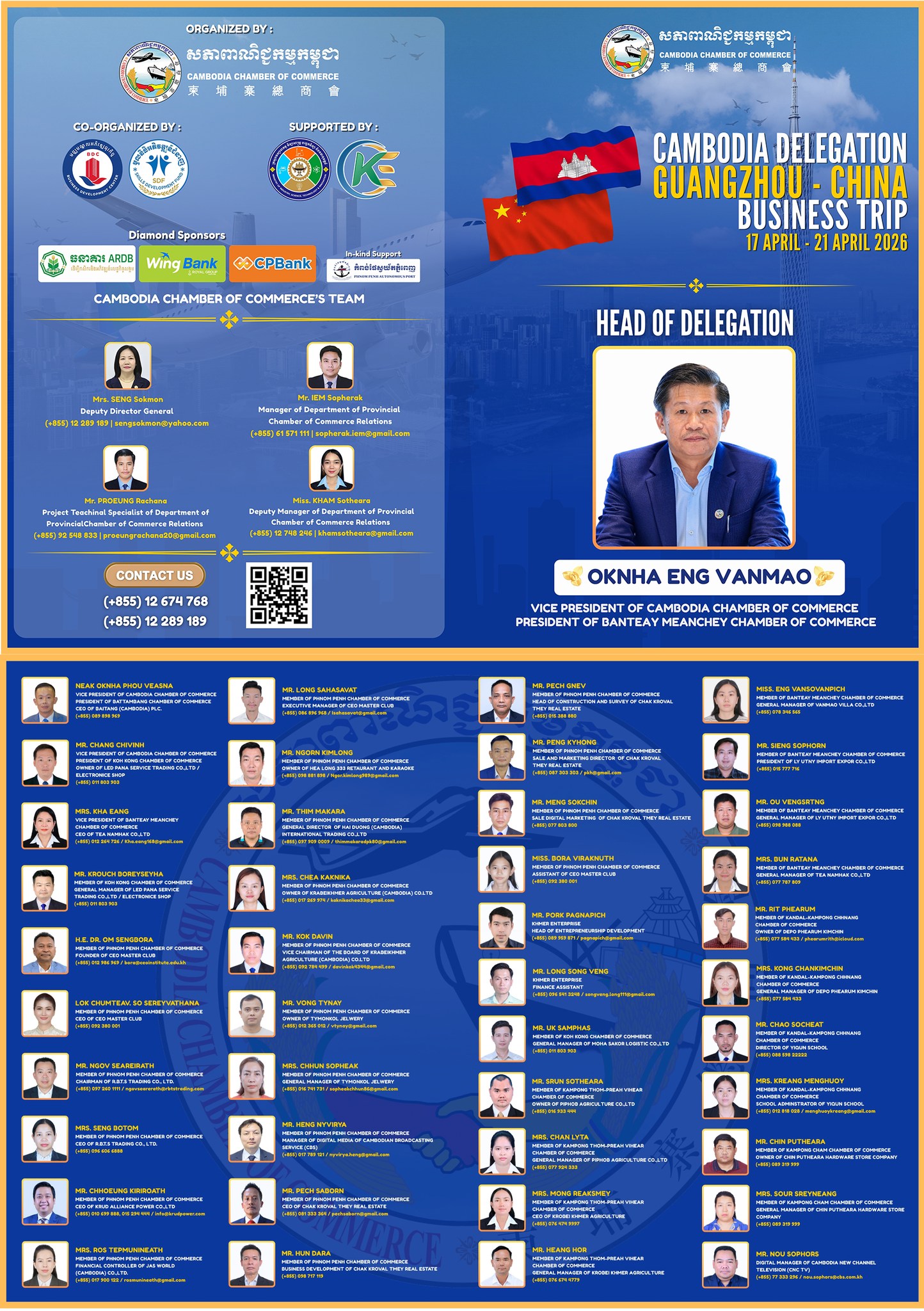 សភាពាណិជ្ជកម្មកម្ពុជា បានឱ្យដឹងថា ដំណើរទស្សនកិច្ចពាណិជ្ជកម្មនេះ នឹងចាប់ពីថ្ងៃទី ១៧ មេសា ដល់ថ្ងៃទី ២១ ខែមេសា ឆ្នាំ២០២៦។ ក្នុងដំណើរទស្សនកិច្ចពាណិជ្ជកម្មនេះ គណៈប្រតិភូសភាពាណិជ្ជកម្មកម្ពុជា នឹងត្រូវ៖ ១.ចូលរួមកម្មវិធីពិព័រណ៍ផលិតផលនាំចេញ នាំចូលប្រទេសចិន (The 139th Canton Fair), ២.ចូលរួមកិច្ចប្រជុំ និងវេទិកាចែករំលែក, ៣.ជំនួបពាណិជ្ជកម្ម និងចាប់ដៃគូរជាមួយក្រុមហ៊ុនចិនល្បីៗ, ៤.ទស្សនកិច្ចរោងចក្រ សហគ្រាសផលិត ដែលមានឧបករណ៍ និងបច្ចេកវិទ្យាទំនើបៗ នៅក្នុងវិស័យឧស្សាហកម្មប្រទេសចិន។