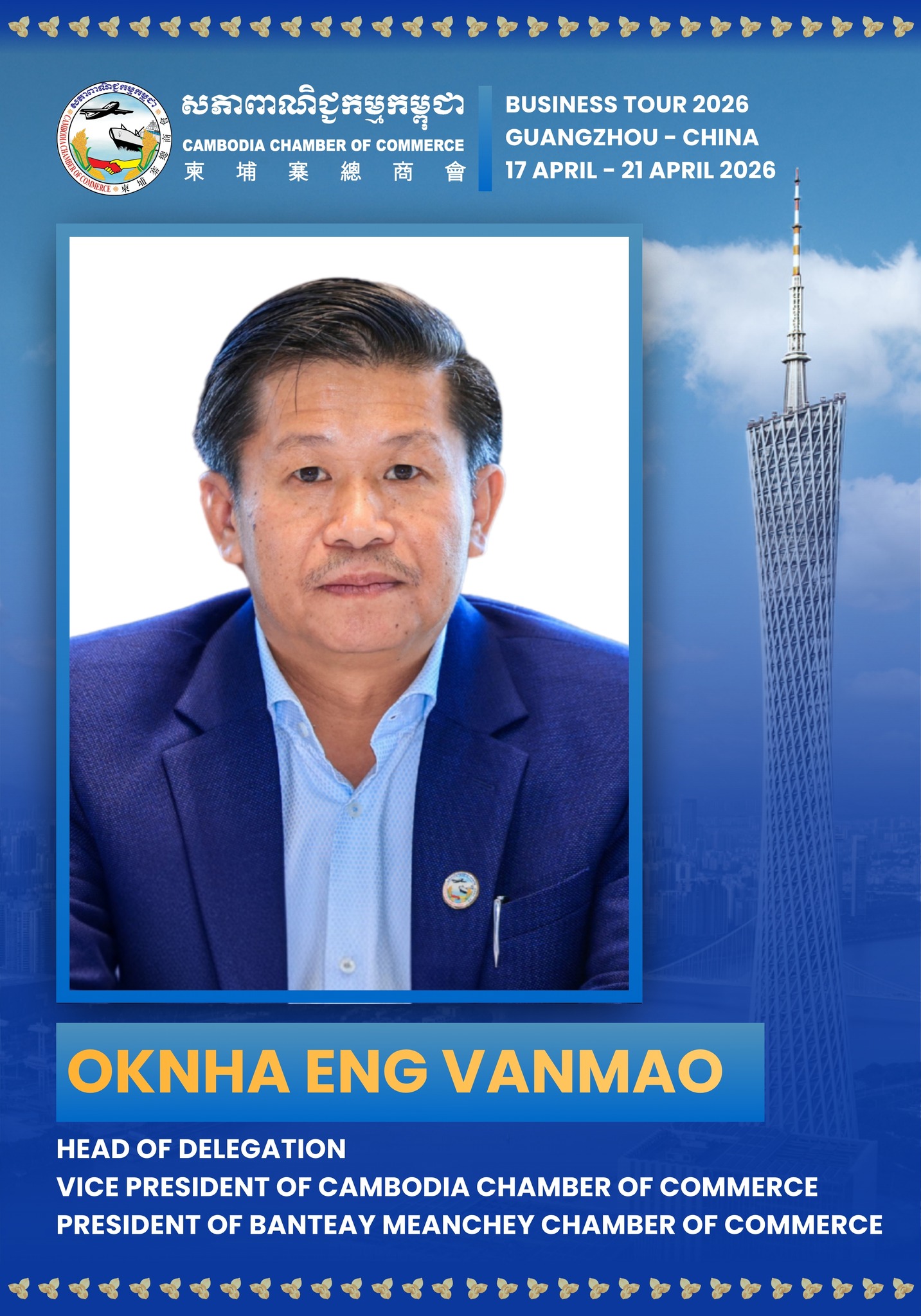 ឧកញ៉ា អ៊ឹង វណ្ណម៉ៅ អនុប្រធានសភាពាណិជ្ជកម្មកម្ពុជា និងជាប្រធានសភាពាណិជ្ជកម្មខេត្តបន្ទាយមានជ័យ តំណាង អ្នកឧកញ៉ា គិត ម៉េង ប្រធានសភាពាណិជ្ជកម្មកម្ពុជា និងជាប្រធានក្រុមប្រឹក្សាពិគ្រោះយោបល់ធុរកិច្ចអាស៊ានសម្រាប់កម្ពុជា អមដំណើរដោយ អ្នកឧកញ៉ា ភួ វាសនា អនុប្រធានសភាពាណិជ្ជកម្មកម្ពុជា និងជាប្រធានសភាពាណិជ្ជកម្មខេត្តបាត់ដំបង នឹងដឹកនាំគណៈប្រតិភូសភាពាណិជ្ជកម្មកម្ពុជា ប្រមាណ ៤០រូប ធ្វើទស្សនកិច្ចពាណិជ្ជកម្មទៅកាន់ទីក្រុងក្វាងចូវ សាធារណរដ្ឋប្រជាមានិតចិន រយៈពេល ៤យប់ ៥ថ្ងៃ។