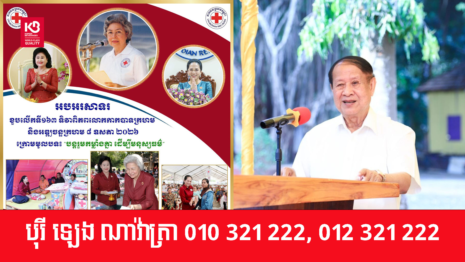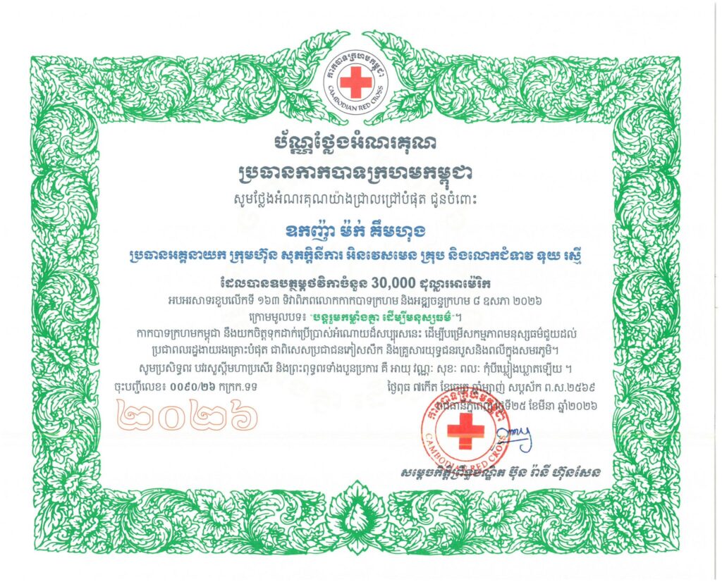 សម្តេចកិត្តិព្រឹទ្ធបណ្ឌិត ប៊ុន រ៉ានី ហ៊ុនសែន ប្រធានកាកបាទក្រហមកម្ពុជា សូមថ្លែងអំណរគុណយ៉ាងជ្រាលជ្រៅបំផុតចំពោះ ឧកញ៉ា ម៉ក់ គឹមហុង និងលោកជំទាវ ដែលបានបរិច្ចាគថវិកាចំនួន ៣ម៉ឺនដុល្លារអាមេរិក ជូនកាកបាទក្រហមកម្ពុជា ក្នុងឱកាសខួបលើកទី១៦៣ ទិវាពិភពលោកកាកបាទក្រហម និងអឌ្ឍចន្ទក្រហម ៨ ឧសភា ឆ្នាំ២០២៦ ក្រោមមូលបទ «បន្តរួមកម្លាំងគ្នា ដើម្បីមនុស្សធម៌»។