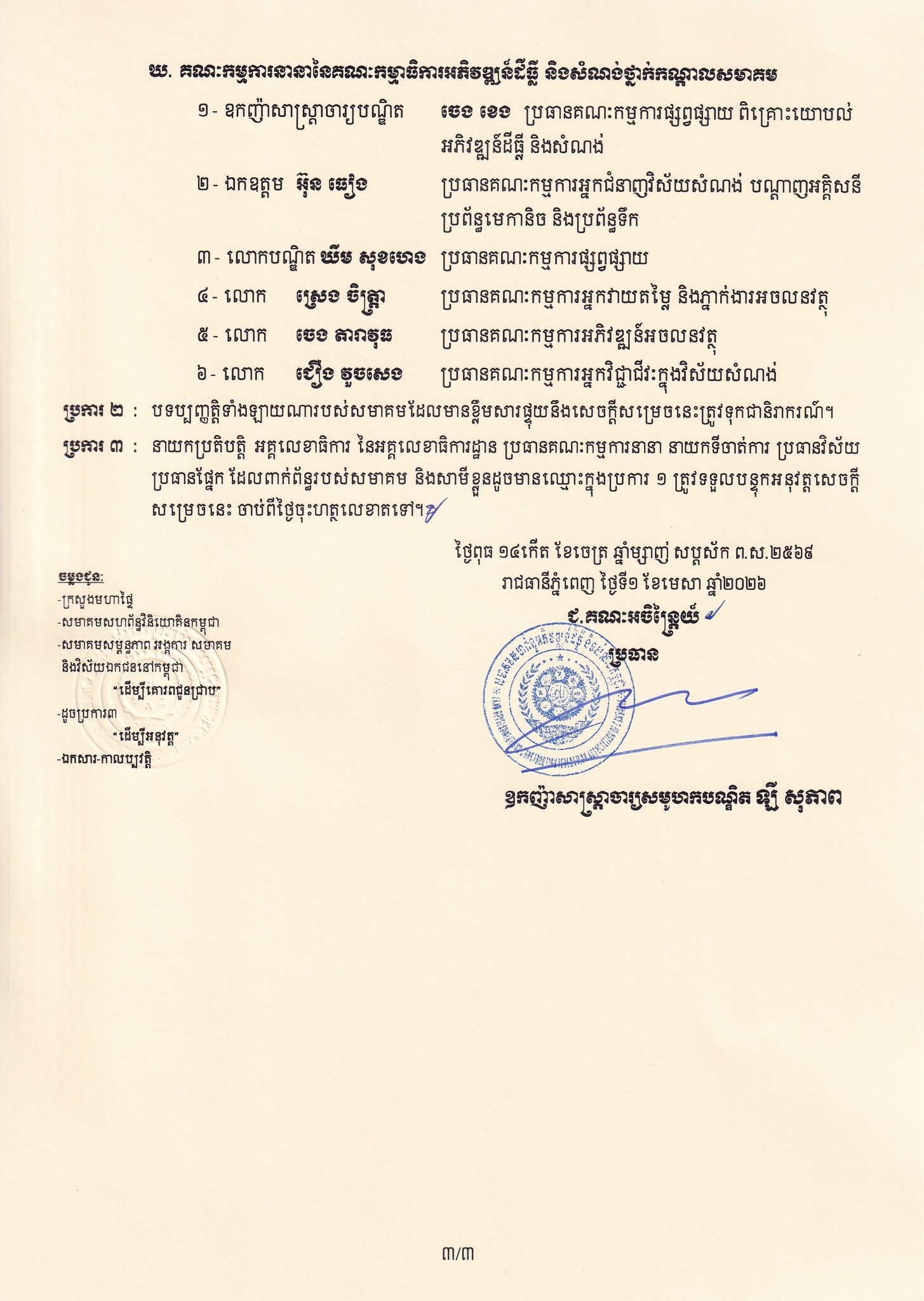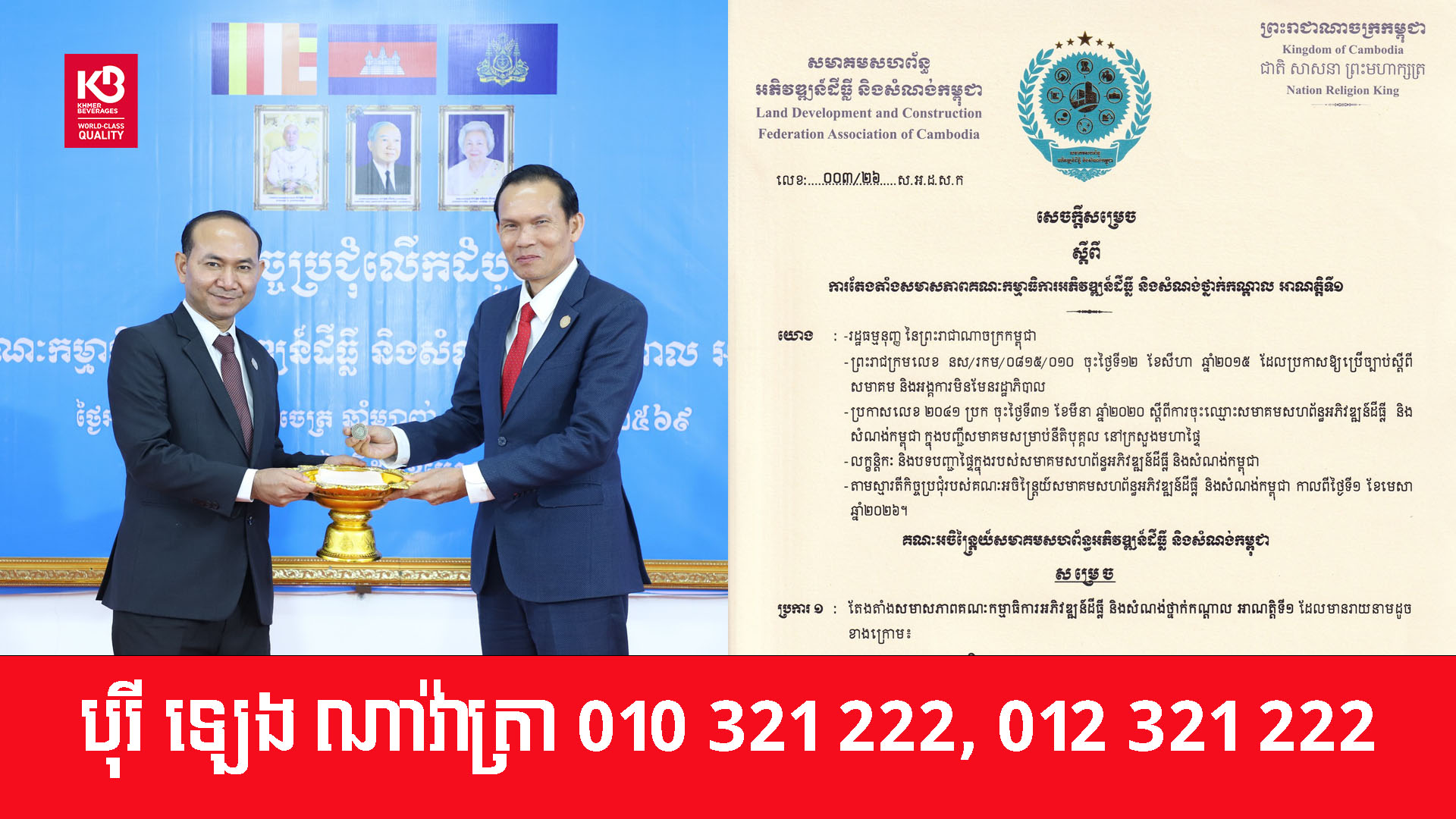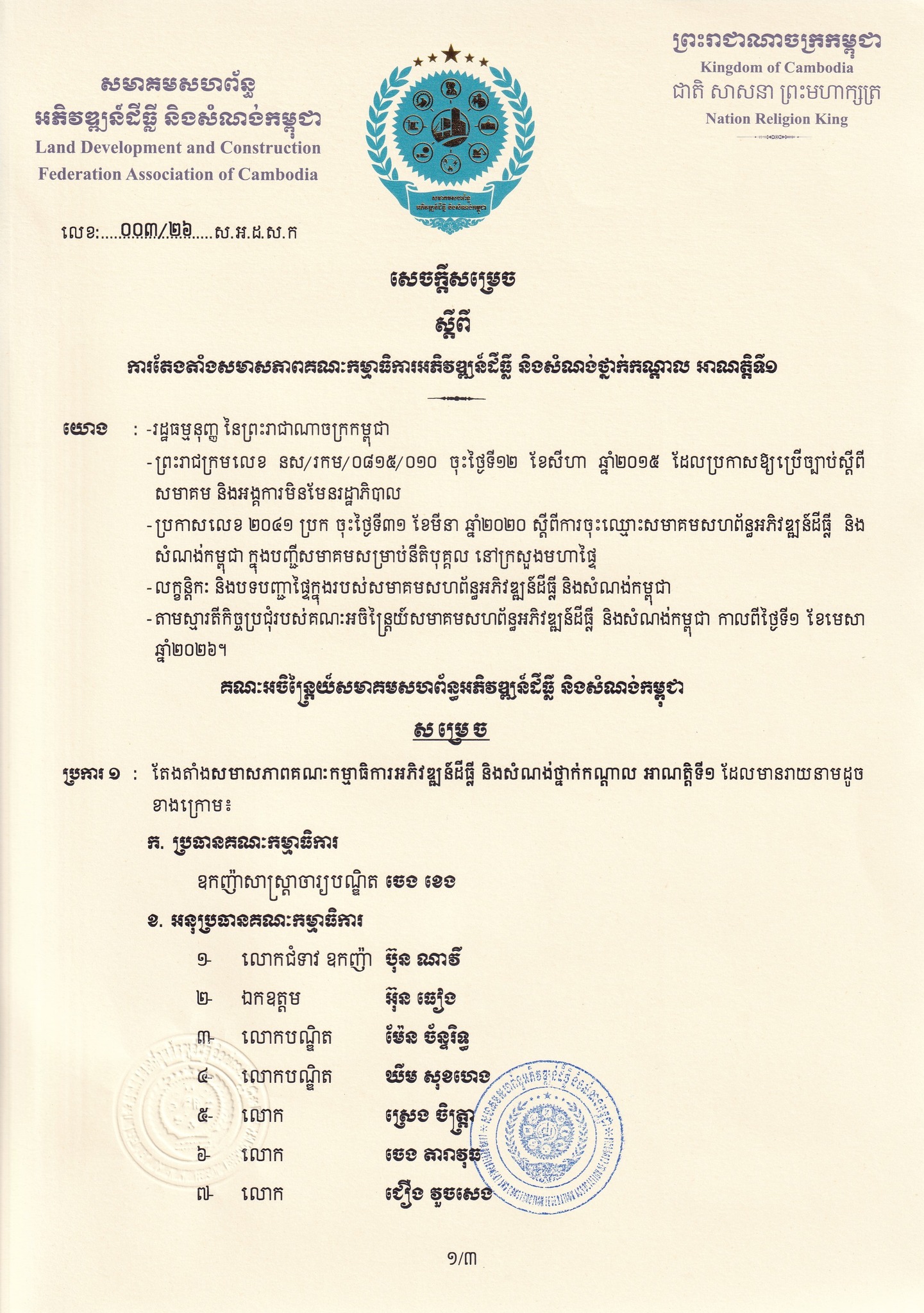 ឧកញ៉ា ឡី សុភាព ប្រធានសមាគមសហព័ន្ធអភិវឌ្ឍន៍ដីធ្លី និងសំណង់កម្ពុជា នៅថ្ងៃទី១ ខែមេសា ឆ្នាំ២០២៦ បានចេញសេចក្តីសម្រេចតែងតាំង ឧកញ៉ា ចេង ខេង អគ្គនាយកក្រុមហ៊ុនអចលទ្រព្យ CPL ជាប្រធានគណៈកម្មាធិការអភិវឌ្ឍន៍ដីធ្លី និងសំណង់ថ្នាក់កណ្តាល អាណត្តិទី១ អមដោយអនុប្រធាន ចំនួន ១៤រូប និងសមាជិក សមាជិកា ចំនួនជាង ២០រូប។