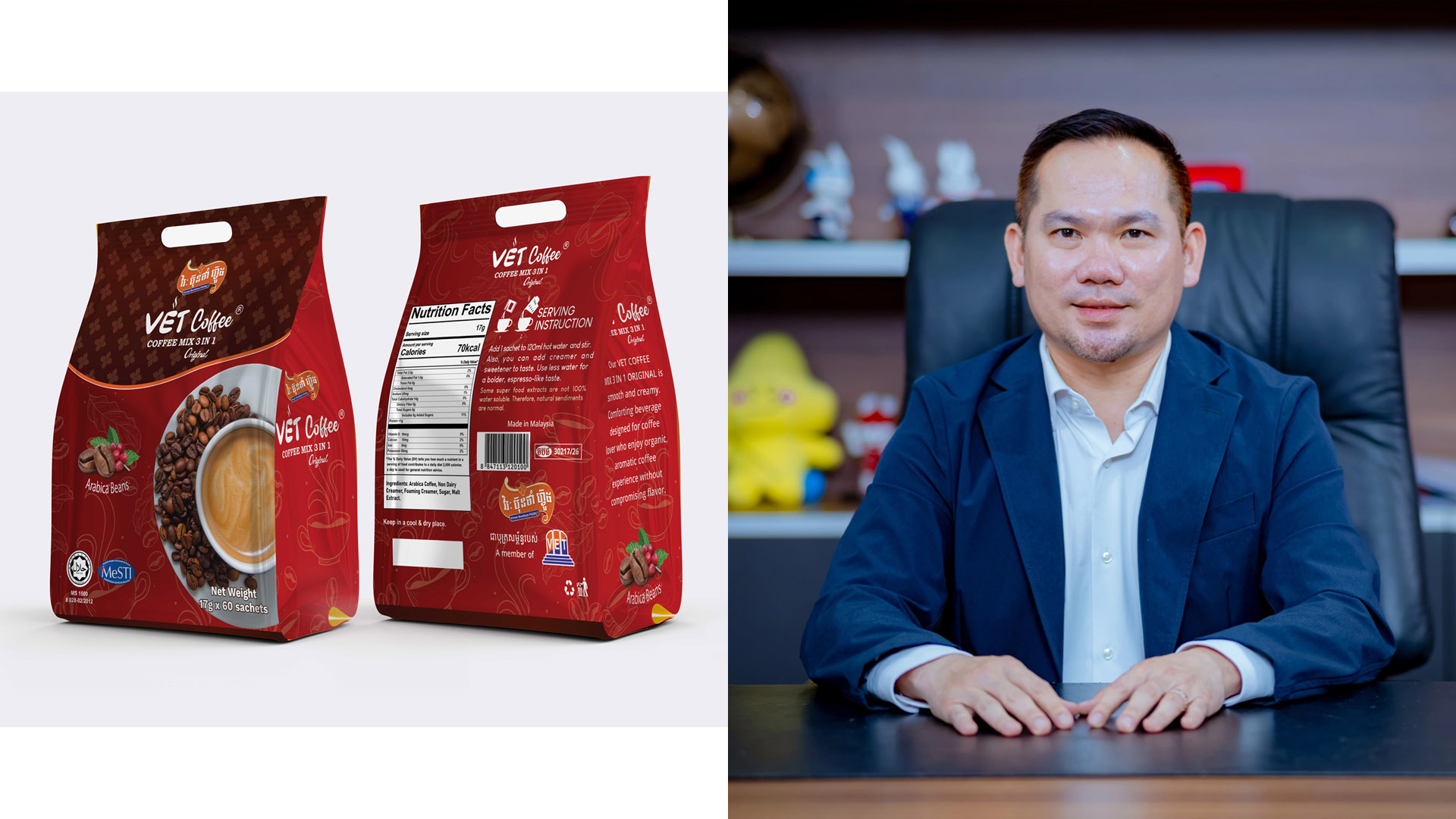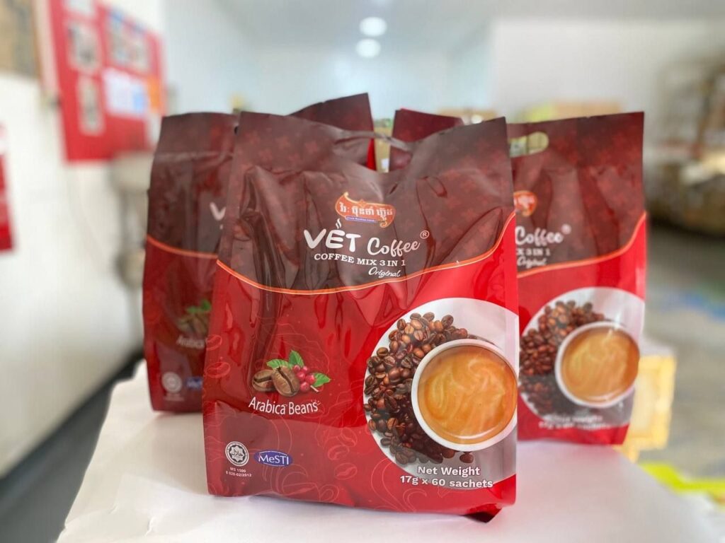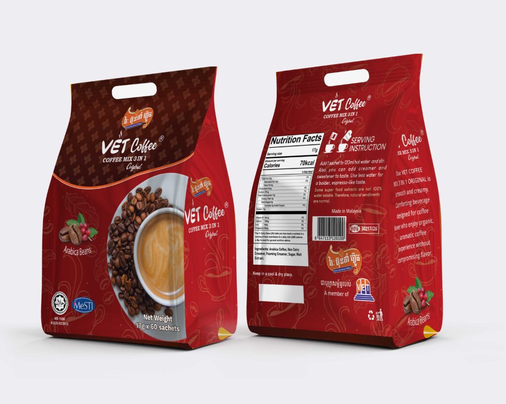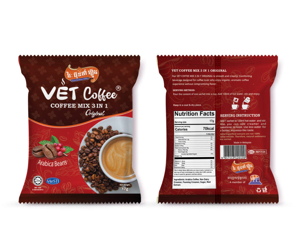 ក្រុមហ៊ុន វិរៈ ប៊ុនថាំ ហ្វ៊ូដ របស់អ្នកឧកញ៉ា បណ្ឌិត សួរ វីរៈ គ្រោងប្រកាសចេញលក់កាហ្វេ VET Coffee, Coffee Mix 3 in 1 Original ចំណុះ ១៧ក្រាមក្នុងមួយកញ្ចប់តូច ក្នុងពេលឆាប់ៗខាងមុខនេះ។