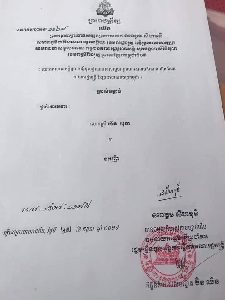 អ្នកស្រី ហ៊ុន សុភា ត្រូវបានព្រះករុណា មហាក្សត្រ នៃព្រះរាជាណាចក្រកម្ពុជា សព្វព្រះរាជហឫទ័យ ប្រទានគោរមងារជា ឧកញ៉ាការ ប្រទានគោរមងារនេះ បានធ្វើឡើងកាលពីថ្ងៃពុធ ទី ២៧ ខែ កក្កដា ឆ្នាំ ២០១៩ កន្លងទៅថ្មីៗនេះ។