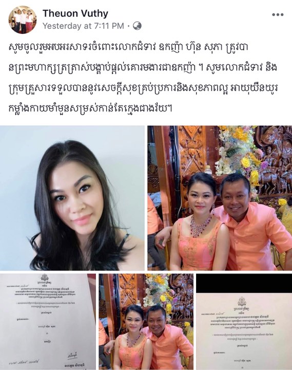 ការទទួលបានងារជា ឧកញ៉ា នេះគឺជាកិត្តិយសដ៏ឧត្តុងឧត្តម សម្រាប់លោកជំទាវឧកញ៉ា និងក្រុមគ្រួសារ ដែលបានចូលរួមចំណែកអភិវឌ្ឍន៍សង្គមជាតិជាមួយរាជរដ្ឋាភិបាល ក៏ដូចជាដើរតួយ៉ាងសំខាន់ក្នុងនាមជាសប្បុរសជនក្នុងការចូលរួមយ៉ាងសកម្មការងារមនុស្សធម៌ ជាពិសេសលោកជំទាវឧកញ៉ាក៏បានចូលរួមចែករំលែកបទពិសោធន៍ និងបង្កើតការងារជាច្រើន ដល់ប្រជាជនខ្មែរ ដែលជាធនធានមនុស្សក្នុងការជំរុញការអភិវឌ្ឍន៍សង្គមជាតិ។