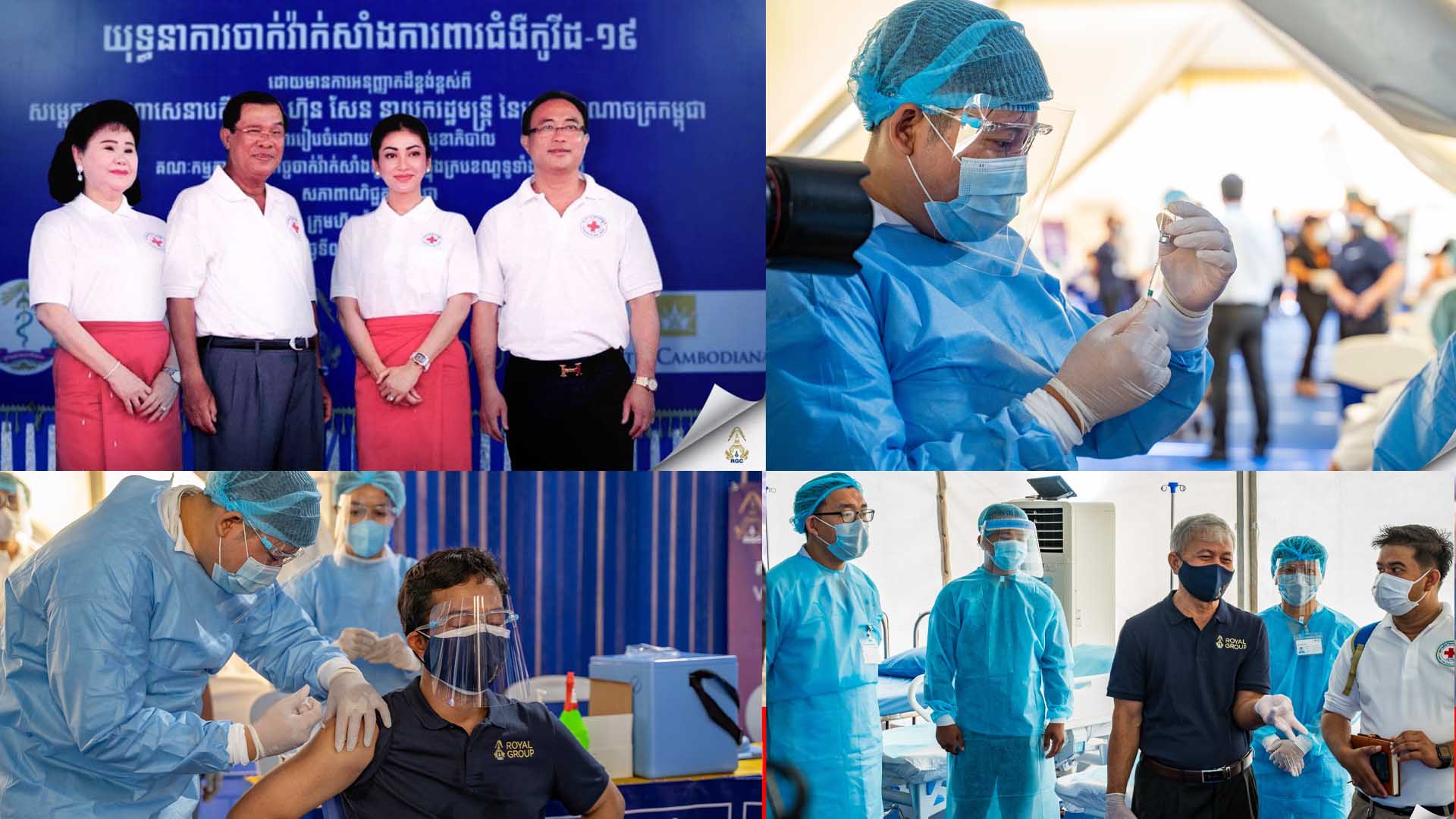 គណៈកម្មការចំពោះកិច្ចចាក់វ៉ាក់សាំងកូវីដ១៩ ក្នុងក្របខណ្ឌទូទាំងប្រទេស នៃក្រសួងសុខាភិបាល និងក្រុមហ៊ុន រ៉ូុយ៉ាល គ្រុប របស់អ្នកឧកញ៉ា គិត ម៉េង នៅថ្ងៃទី២មេសានេះ បានបើកយុទ្ធនាការចាក់វ៉ាក់សាំងបង្ការកូវីដ១៩ ដល់បុគ្គលិកប្រមាណជាង ១២០០នាក់ នៅសណ្ឋាគារ កាំបូឌីយ៉ាណា រាជធានីភ្នំពេញ។