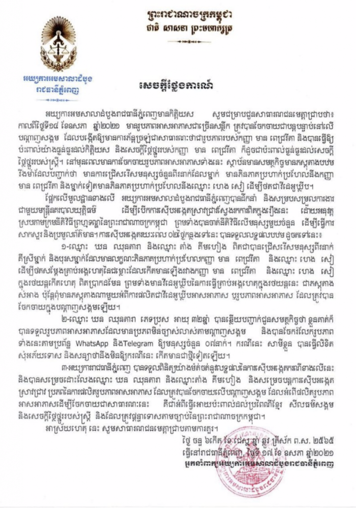 លោកឧកញ៉ា ឃន ឈុនដារ៉ា និងភរិយាអ្នកស្រី តាំង គីមហៀង ត្រូវបានតុលារការសម្រេចដោះលែងហើយ។ នេះបើតាមសេចក្តីថ្លែងការណ៍របស់អយ្យការអមសាលាតំបូងរាជធានីភ្នំពេញឲ្យដឹងនៅរសៀលថ្ងៃទី១៧ ខែឧសភា នេះ។