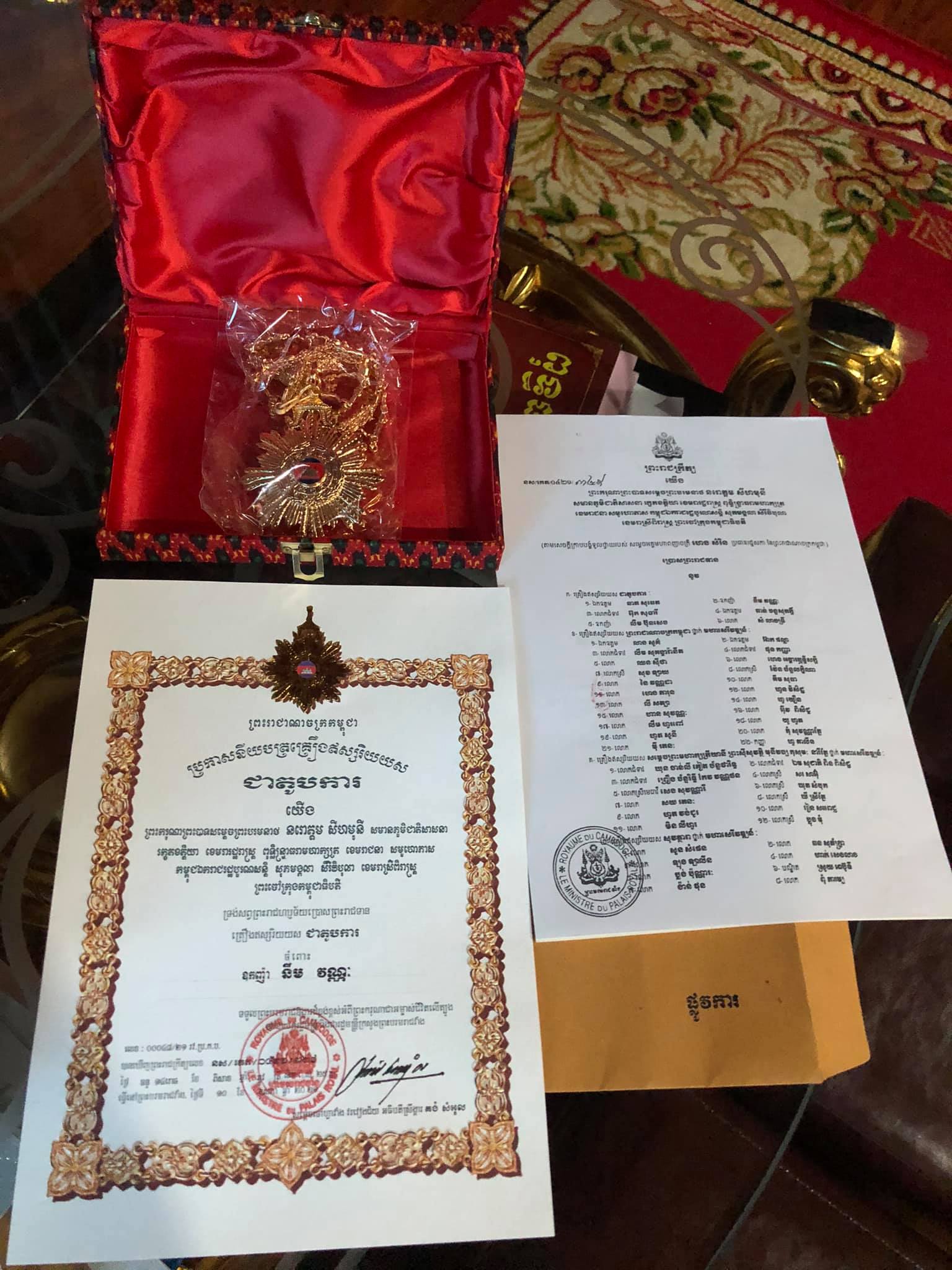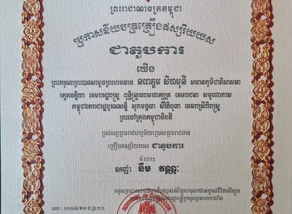 ព្រះករុណាព្រះបាទសម្តេចព្រះបរមនាថ នរោត្ត សីហមុនី ព្រះមហាក្សត្រនៃកម្ពុជា ប្រទានគ្រឿងឥស្សរិយយស “ជាតូបការ” ប្រភេទទី១ ជាប្រភេទមាតុប្រទេស ដល់លោកជំទាវឧកញ៉ា នឹម វណ្ណៈ កាលពីថ្ងៃទី១០ ខែឧសភា ឆ្នាំ២០២១។