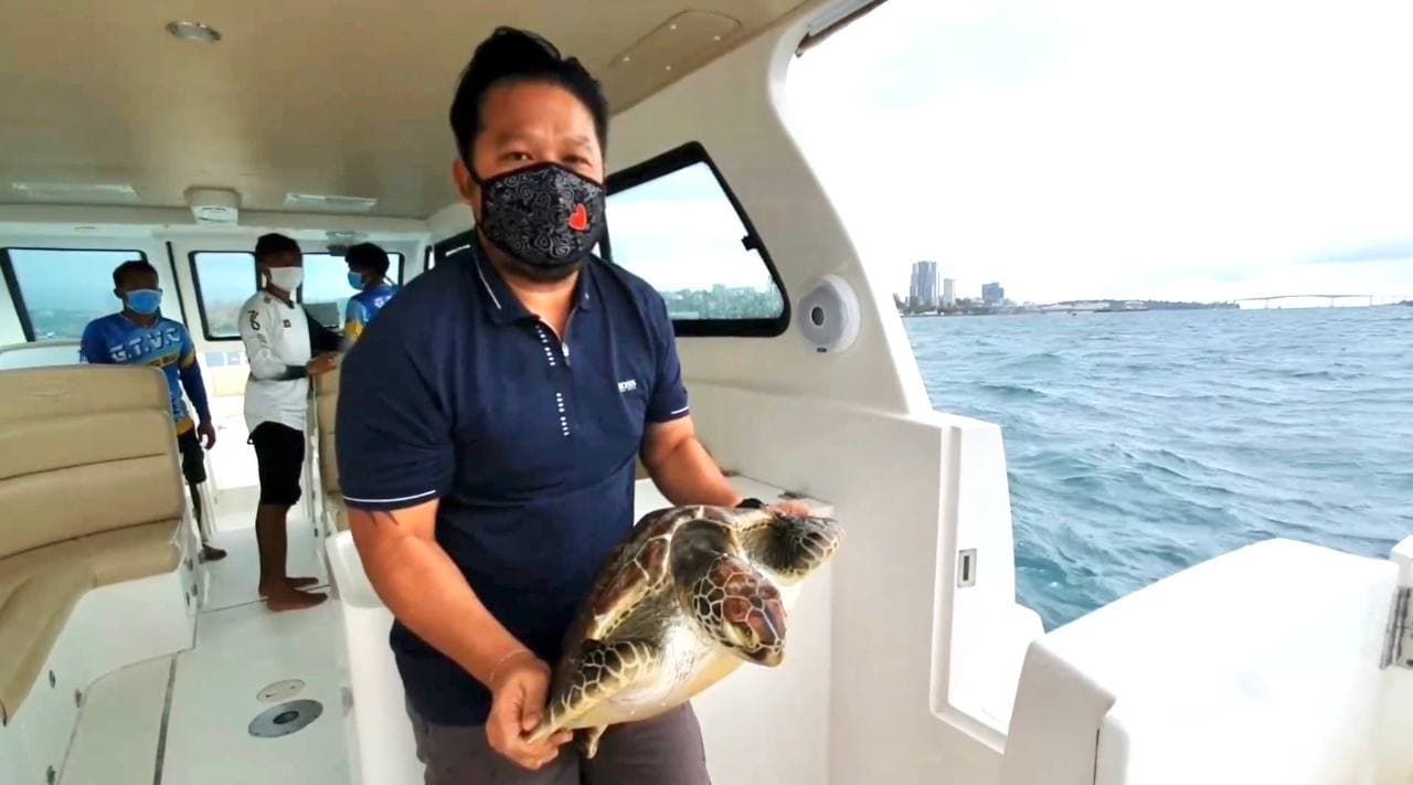 ឧកញ៉ា ទៀ វិចិត្របានឲ្យដឹងថា សត្វល្មិច ឬអណ្តើកសមុទ្រ ដែលបាននាំយកមកប្រលែងក្នុងសមុទ្រមួយក្បាលនេះគឺលោកទទួលបានពីបងប្អូនក្រុមអ្នកនេសាទយកមកប្រគល់ឲ្យ។