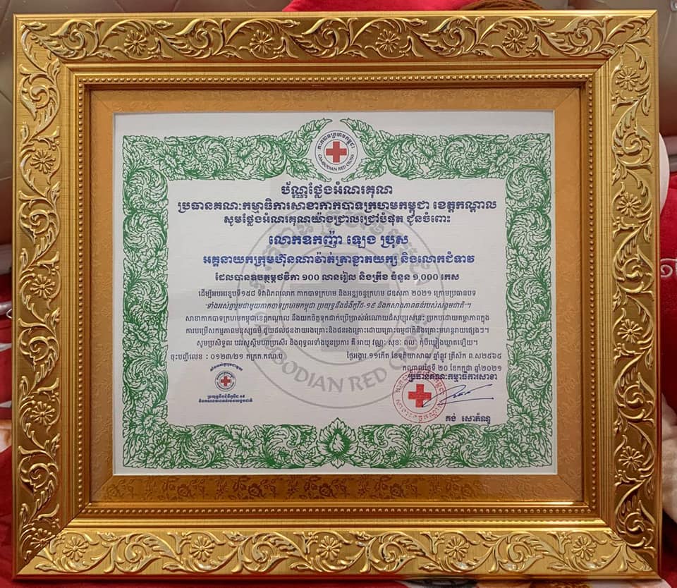 លោកឧកញ៉ា ឡេង ប្រុស និងលោកជំទាវ អគ្គនាយកក្រុមហ៊ុន ណាវ៉ាត្រា ខ្នាតយក្ស និងក្រុមគ្រួសារត្រកូល “ឡេង” ដែលបានចូលរួមឧបត្ថម្ភថវិកាចំនួន ១០០,០០០,០០០រៀល (២៥,០០០ដុល្លារ) និងត្រីខកំប៉ុងចំនួន១,០០០កេស ប្រគល់ជូនសាខាកាកបាទក្រហមកម្ពុជាខេត្តកណ្ដាល ដើម្បីចូលរួមចំណែកទ្រទ្រង់ដល់សកម្មភាពមនុស្សធម៌របស់កាកបាទក្រហមកម្ពុជា នៅថ្ងៃទី២១ ខែកក្កដា ឆ្នាំ២០២១នេះ។