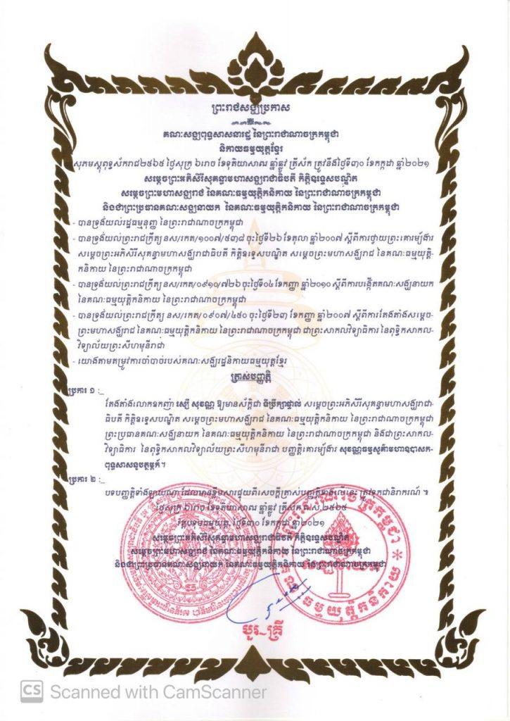 សម្តេចព្រះមហាសង្ឃរាជ បួរ គ្រី ប្រទានគោរមងារជាទីប្រឹក្សាផ្ទាល់ជូនអ្នកជំនួញអចលនទ្រព្យឧកញ៉ា សឿ សុវណ្ណ