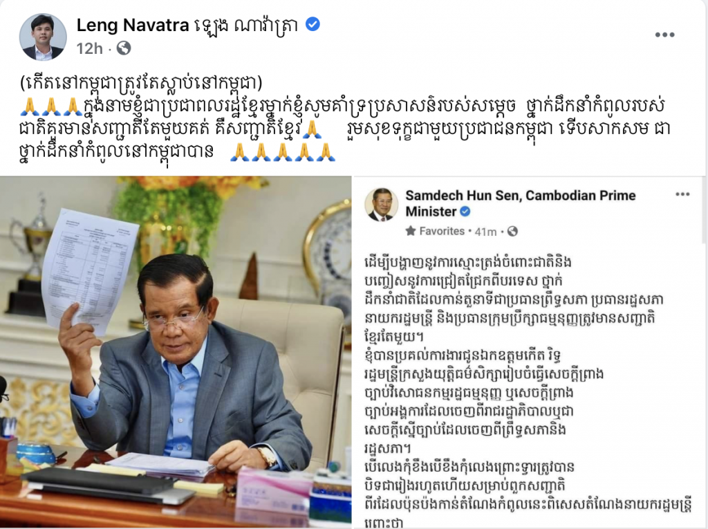 អ្នកឧកញ៉ា ឡេង ណាវ៉ាត្រា បានថ្លែងលើបណ្តាញសង្គមហ្វេសប៊ុករបស់ខ្លួននៅថ្ងៃទី៧ ម្សិលមិញថា៖ “(កើតនៅកម្ពុជាត្រូវតែស្លាប់នៅកម្ពុជា….) ក្នុងនាមខ្ញុំជាប្រជាពលរដ្ឋខ្មែរម្នាក់ខ្ញុំសូមគាំទ្រប្រសាសន៏របស់សម្តេច ថ្នាក់ដឹកនាំកំពូលរបស់ជាតិ គួរមានសញ្ជាតិតែមួយគត់ គឺសញ្ជាតិខ្មែរ ដែលន័យនេះគឺរួមសុខទុក្ខជាមួយប្រជាជនកម្ពុជា ទើបសាកសម ជាថ្នាក់ដឹកនាំកំពូលនៅកម្ពុជាបាន “។