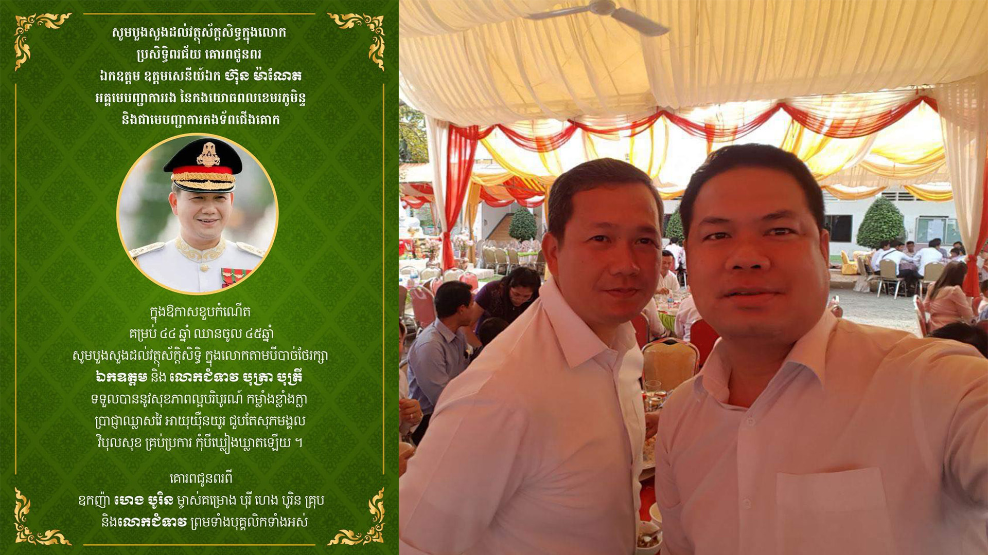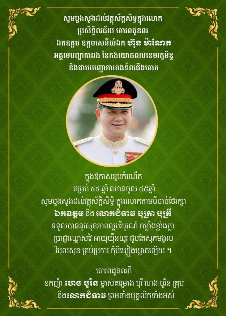 ឧកញ៉ា ហេង បូរិន សូមគោរពជូនពរ ឯកឧត្តមឧត្តមសេនីយ៍ឯក ហ៊ុន ម៉ាណែត ក្នុងឱកាសខួបកំណើត ជុំវិញឧកញ៉ា ថ្ងៃពុធ ២០ តុលា ២០២១ អ្នកឧកញ៉ាវត្តភ្នំ'