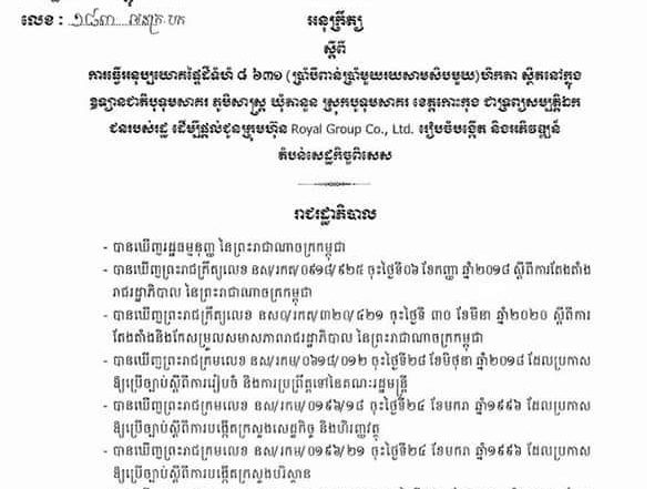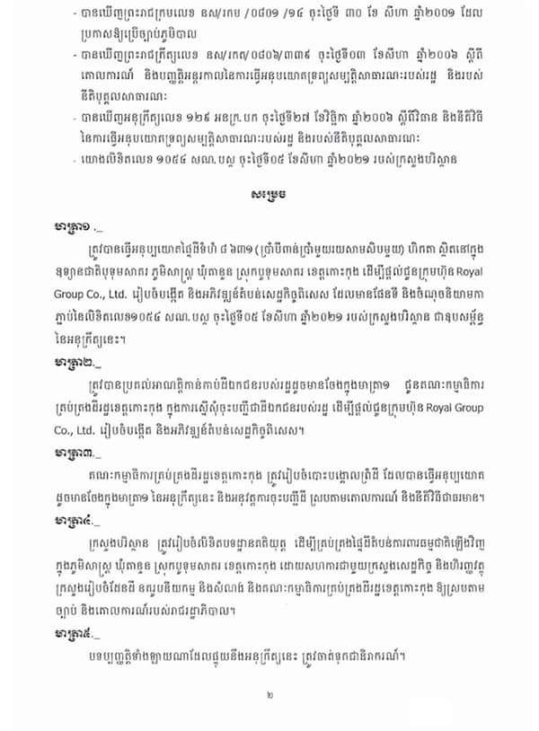 គួររម្លឹកជូនថា យោងតាមលិខិតរបស់ទីស្តីការគណៈរដ្ឋមន្ត្រី ចុះថ្ងៃទី០៧ ខែវិច្ឆិកា ឆ្នាំ២០២០ បានឲ្យដឹងថា រដ្ឋាភិបាល សម្រេចផ្តល់ដីសម្បទានទំហំ ១ម៉ឺនហិកតា ស្ថិតនៅក្នុងឧទ្យានជាតិបុទុមសាគរ ខេត្តកោះកុងឲ្យក្រុមហ៊ុន Royal Group Co., Ltd ដើម្បីអភិវឌ្ឍន៍ជាតំបន់សេដ្ឋកិច្ចពិសេស។