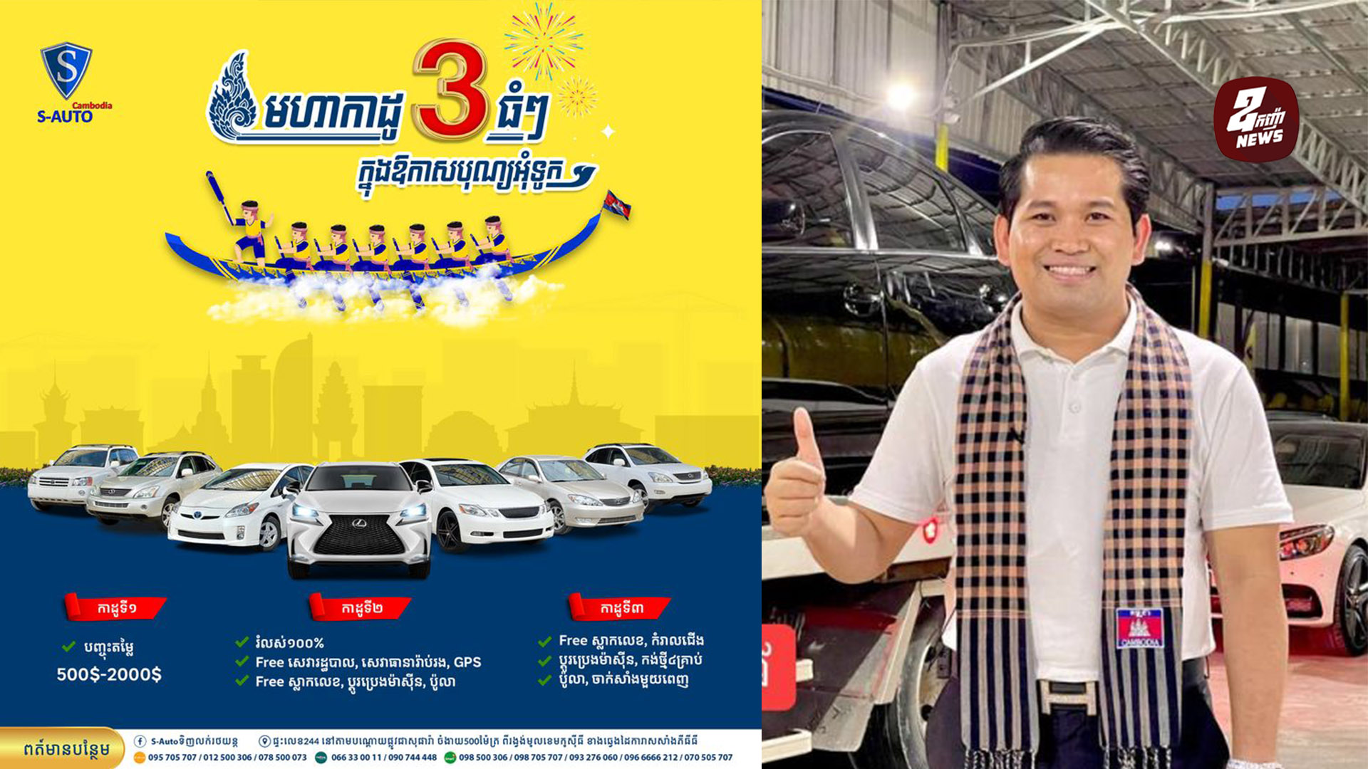 ឱ្យតែកម្មវិធីបុណ្យជាតិធំៗចូលមកដល់ ឃ្លាំងទិញលក់រថយន្ត S-Auto របស់ ឧកញ៉ា ប៊ុន រតនាសេម មិនដែលមើលរំលង ការផ្ដល់ជូនកាដូពិសេសដល់អតិថិជនជាទីស្រលាញ់របស់ខ្លួនឡើយ។