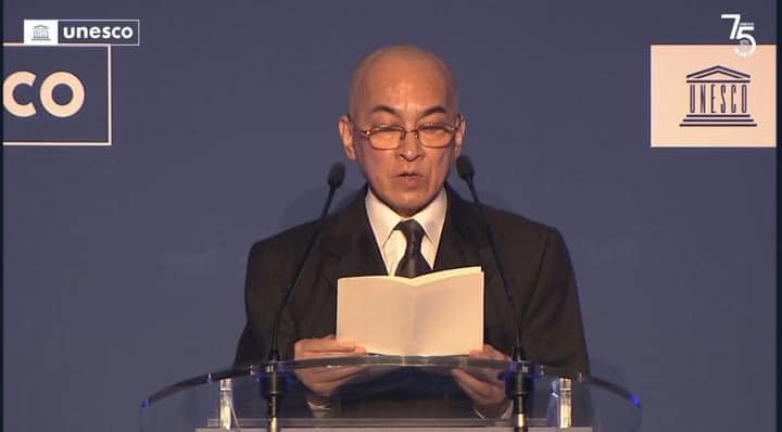 នៅក្នុងពិធីប្រារព្ធខួប៧៥ឆ្នាំនៃការបង្កើតអង្គការយូណេស្កូ ព្រះករុណា ព្រះបាទសម្តេចព្រះបរមនាថនរោត្តម សីហមុនី ជាមួយនឹងវត្តមានរបស់ប្រមុខរដ្ឋ និងរដ្ឋាភិបាលពីប្រទេសចំនួន ២០ ព្រះអង្គបានយាងឡើងថ្លែងព្រះរាជសុន្ទរកថា ដែលនៅក្នុងនោះ ព្រះអង្គបានសង្កត់ធ្ងន់លើសកម្មភាព របស់អង្គការយូណេស្កូនៅប្រទេសកម្ពុជា។