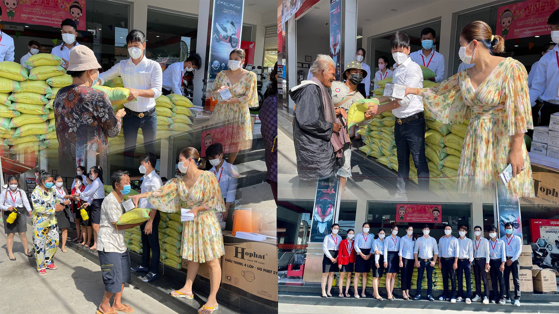 អង្ករ និងថវិកាមួយចំនួន សរុបចំនួន ៣០០ឈុត ត្រូវបានលោក ឧកញ៉ា និងលោកជំទាវ រៀបចំចែកជូនបងប្អូនប្រជាពលរដ្ឋក្រីក្រដោយផ្ទាល់ដៃ នៅទីតាំងហាងលក់ម៉ូតូហុងដា អុឹង ប៉ោបុី ដែលមានទីតាំងស្ថិតនៅ ផ្លូវ2004 ភូមិតាងួន សង្កាត់ កាកាប ខណ្ឌពោធិ៍សែនជ័យ រាជធានីភ្នំពេញ។