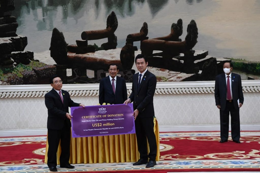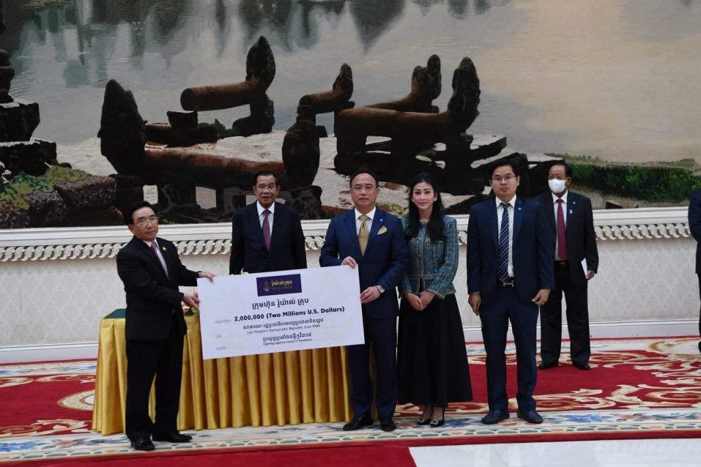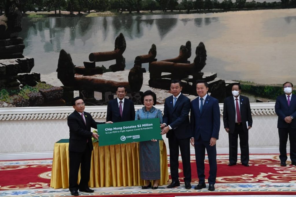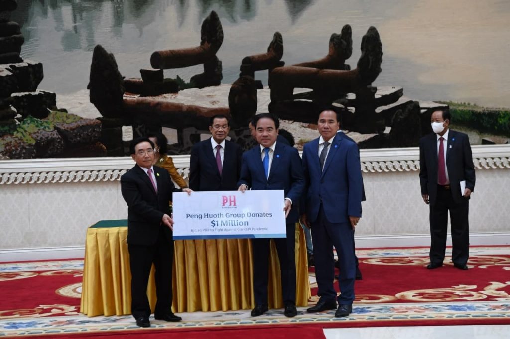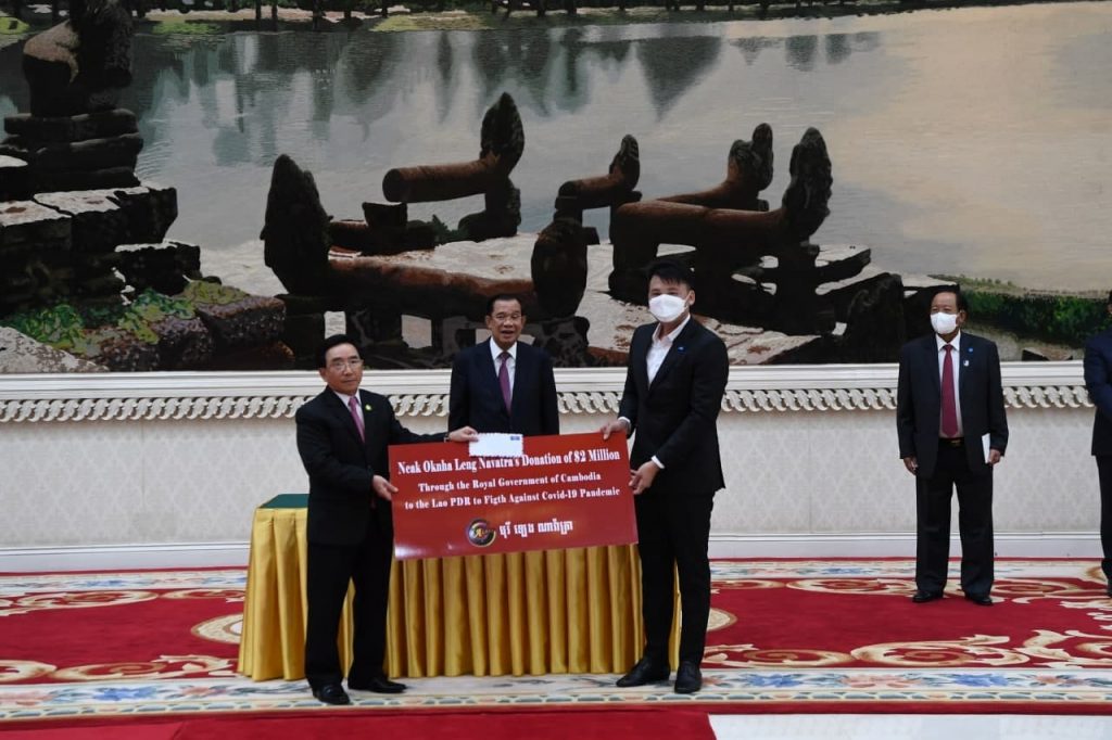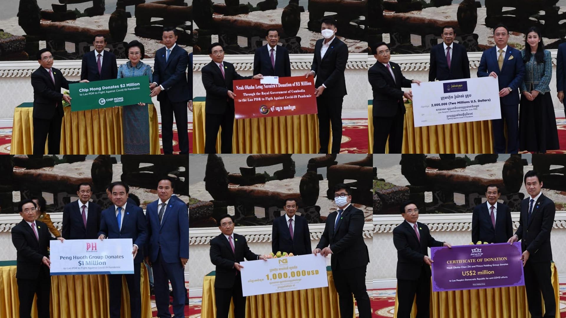 អ្នកឧកញ៉ា ឧកញ៉ាល្បីឈ្មោះលំដាប់កំពូលរបស់កម្ពុជាចំនួន៦រូប រួមគ្នាបរិច្ចាគទឹកប្រាក់ ១០លានដុល្លារ ជូនដល់រដ្ឋាភិបាលឡាវ ដើម្បីចូលរួមប្រយុទ្ធប្រឆាំងនឹងជំងឺកូវីដ១៩ នៅក្នុងប្រទេសឡាវ ក្រោមវត្តមានសម្តេចតេជោ ហ៊ុន សែន នាយករដ្ឋមន្រ្តីកម្ពុជា និងលោក ផនខាំ វីផាវ៉ាន់ នាយករដ្ឋមន្ត្រីឡាវ នៅវិមានសន្តិភាព នាល្ងាចថ្ងៃចន្ទនេះ។