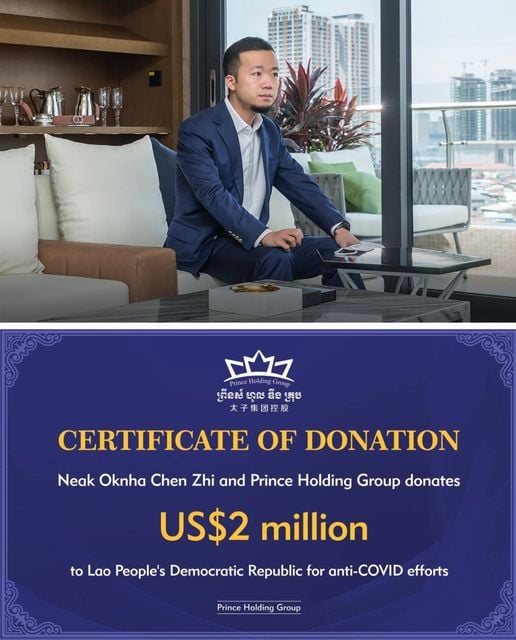 ទន្ទឹមនឹងនោះ អ្នកឧកញ៉ា ចេន ហ្សុី ប្រធានសម្ព័ន្ធក្រុមហ៊ុន ព្រីនស៍ គ្រុប បានបរិច្ចាគថវិកាចំនួន ២ លានដុល្លារអាមេរិក បូករួមនឹងកន្លងទៅថវិកាចំនួន ១លានដុល្លារដែលនោះ លើកឡើងថា ដើម្បីជួយដល់រដ្ឋាភិបាលឡាវ ក្នុងកិច្ចខិតខំប្រឹងប្រែងប្រយុទ្ធប្រឆាំងនឹងការរីករាលដាលនៃជំងឺកូវីដ-១៩។ បន្ថែមលើនេះ ក្រុមហ៊ុន ព្រីនស៍ ក៏មានគោលបំណងចូលរួមចំណែកក្នុងតួនាទីនៃភាពជាអ្នកដឹកនាំរបស់កម្ពុជាអំពីកិច្ចការក្នុងតំបន់ ខណៈដែលនេះជាពេលវេលាដ៏លំបាកមួយសម្រាប់ប្រជាជាតិអាស៊ីអាគ្នេយ៍ទាំងមូល។