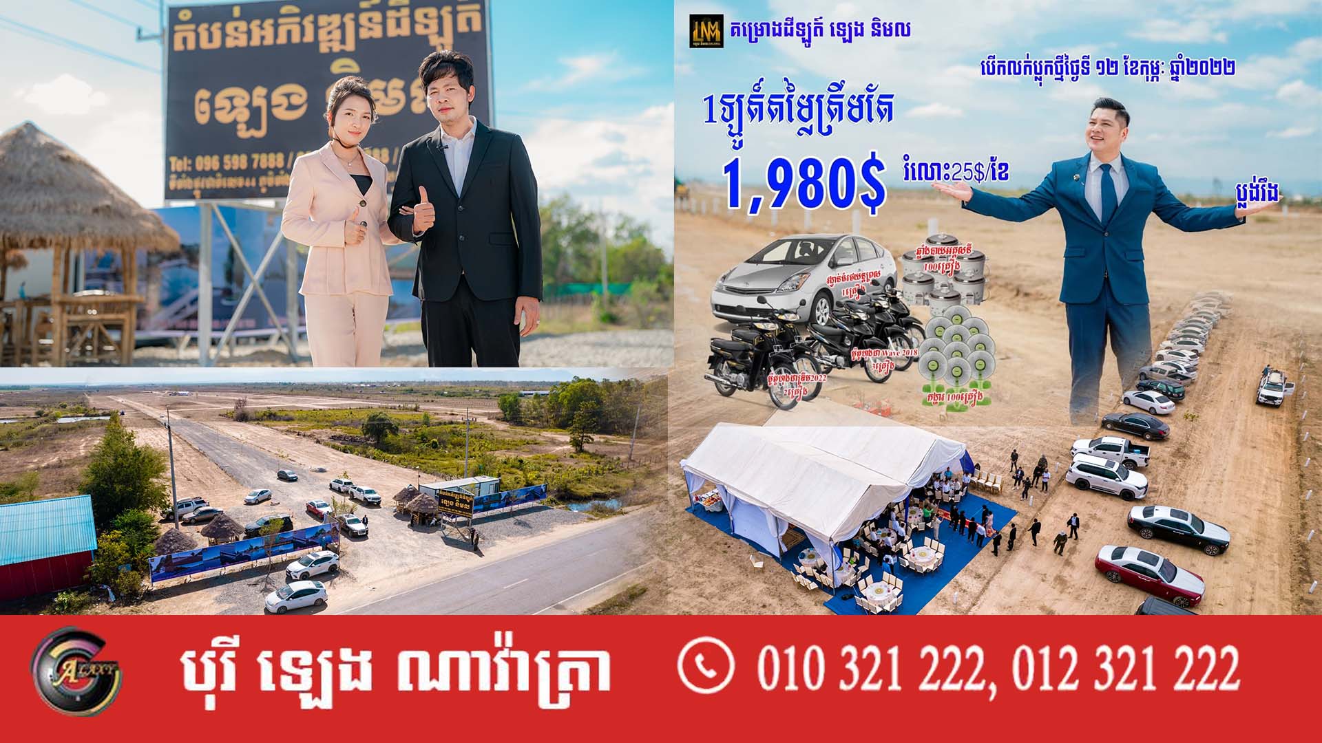 ឱកាសមាស ក្លាយជាម្ចាស់ដីឡូត៍ និងម្ចាស់រថយន្ត ចំថ្ងៃហុងស៊ុយ ថ្ងៃទី១២ ខែ០២ ឆ្នាំ២០២២ខាងមុខនេះ ពីគម្រោងដីឡូត៍ក្រុមហ៊ុន ឡេង និមល ឯ.ក របស់ឧកញ៉ា ឡេង និមល មកដល់ហើយ។