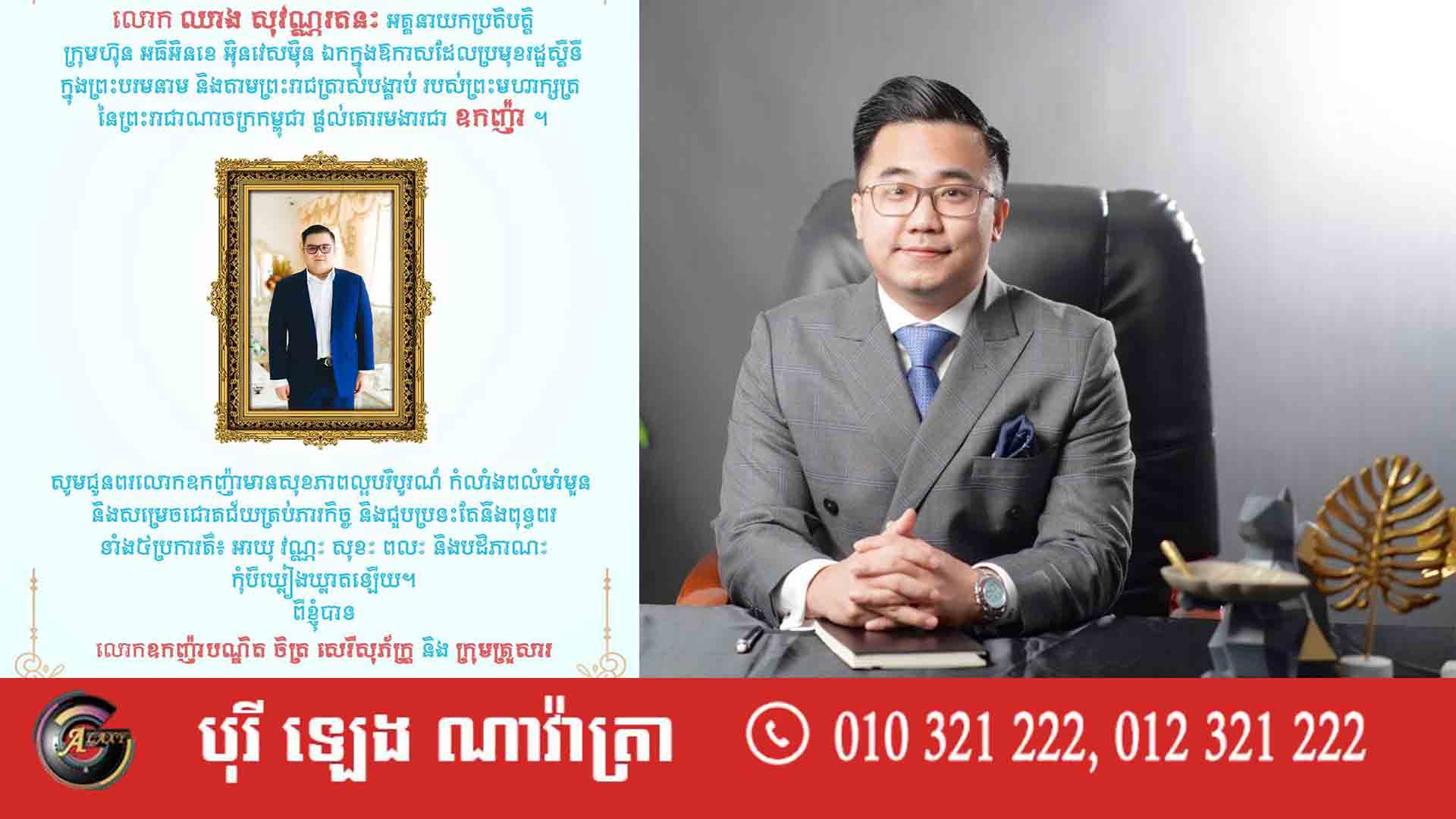 ឧកញ៉ាបណ្ឌិត ចិត្រ សេរីសុភ័ក្ត្រ ស្ថាបនិកក្រុមហ៊ុន Luxury Smile Beauty Group ផ្ញើសារជូនពរដល់ លោក ឈាង សុវណ្ណរតនៈ ដែលត្រូវបាន សម្តេចវិបុលសេនាភក្តី សាយ ឈុំ ប្រមុខរដ្ឋស្តីទីព្រះករុណា ព្រះបាទ សម្តេចព្រះបរមនាថ នរោត្តម សីហមុនី ព្រះមហាក្សត្រកម្ពុជា ត្រាស់បង្គាប់តែងតាំងលោកឡើងជា «ឧកញ៉ា» កាលពីថ្ងៃទី៣១ ខែមីនា ឆ្នាំ២០២២នេះ។